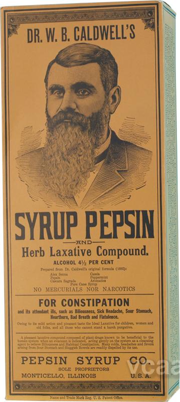 Oversized Dr. W.B. Caldwell's Syrup Pepsin Store Display Cardboard Box, "And Herb Laxative Compound - For Constipation" in great condition - 8" x 5" x 20" tall