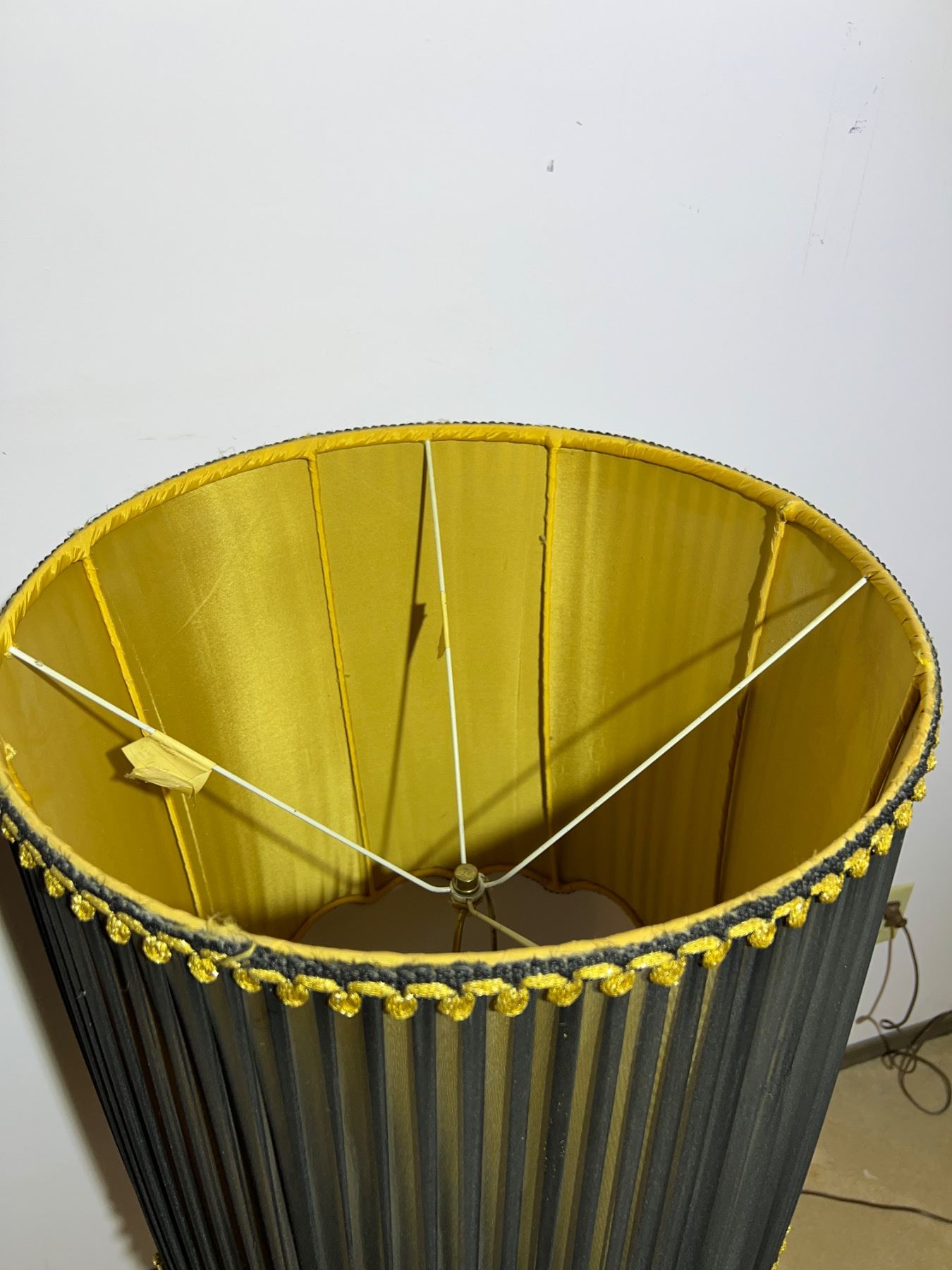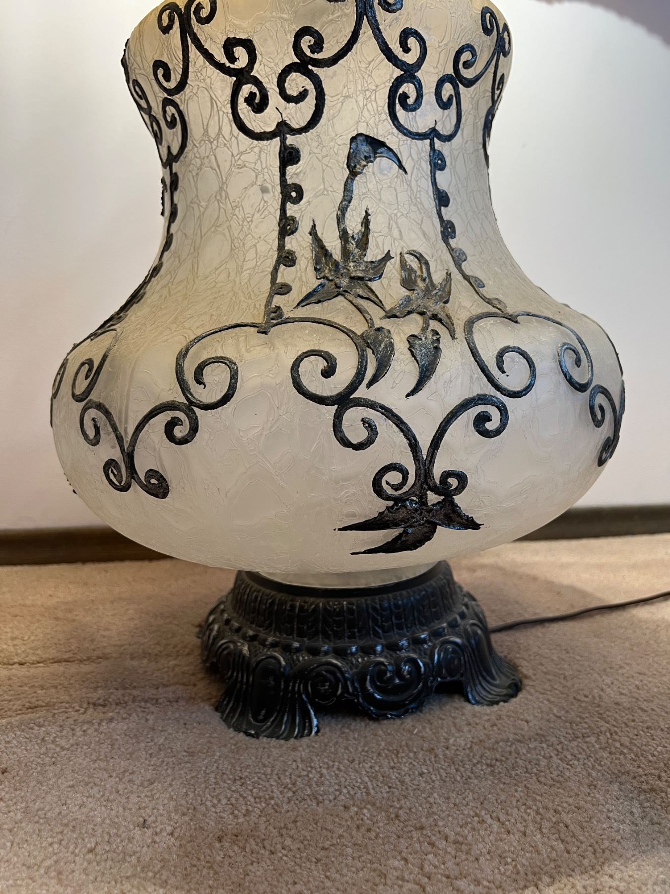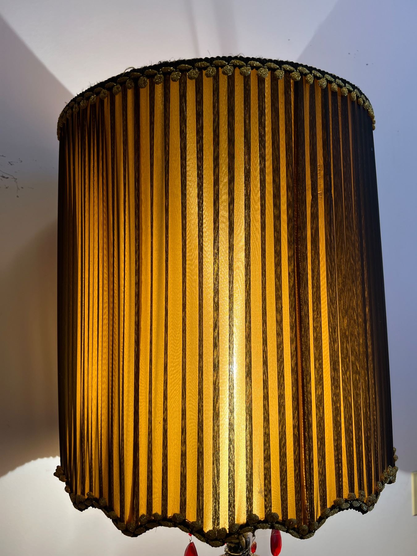 Both lights are in working condition, the frosted glass base also lights up, small dime sized stain on the inside of the lamp shade, Measures 18.5"diameter x 45"H