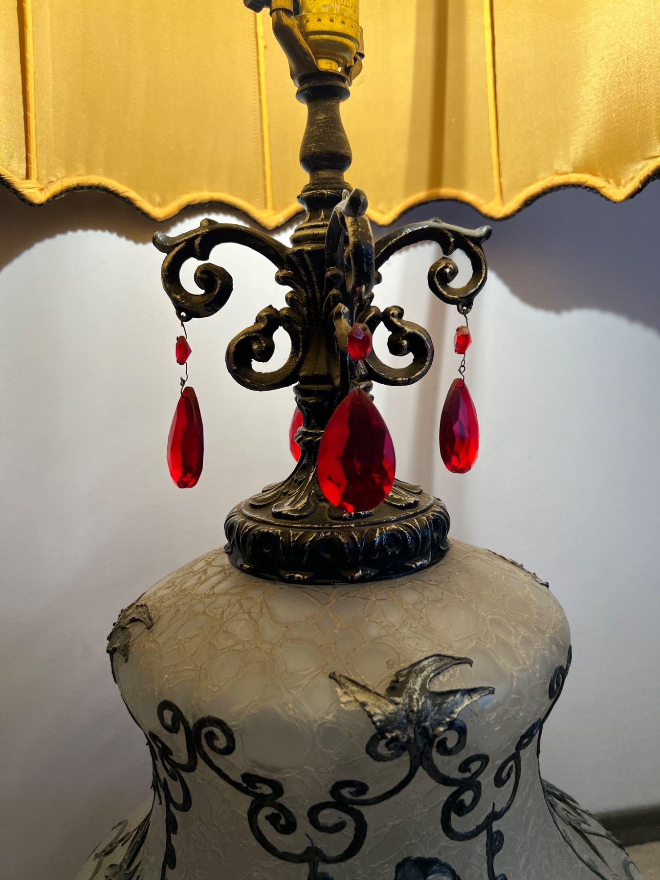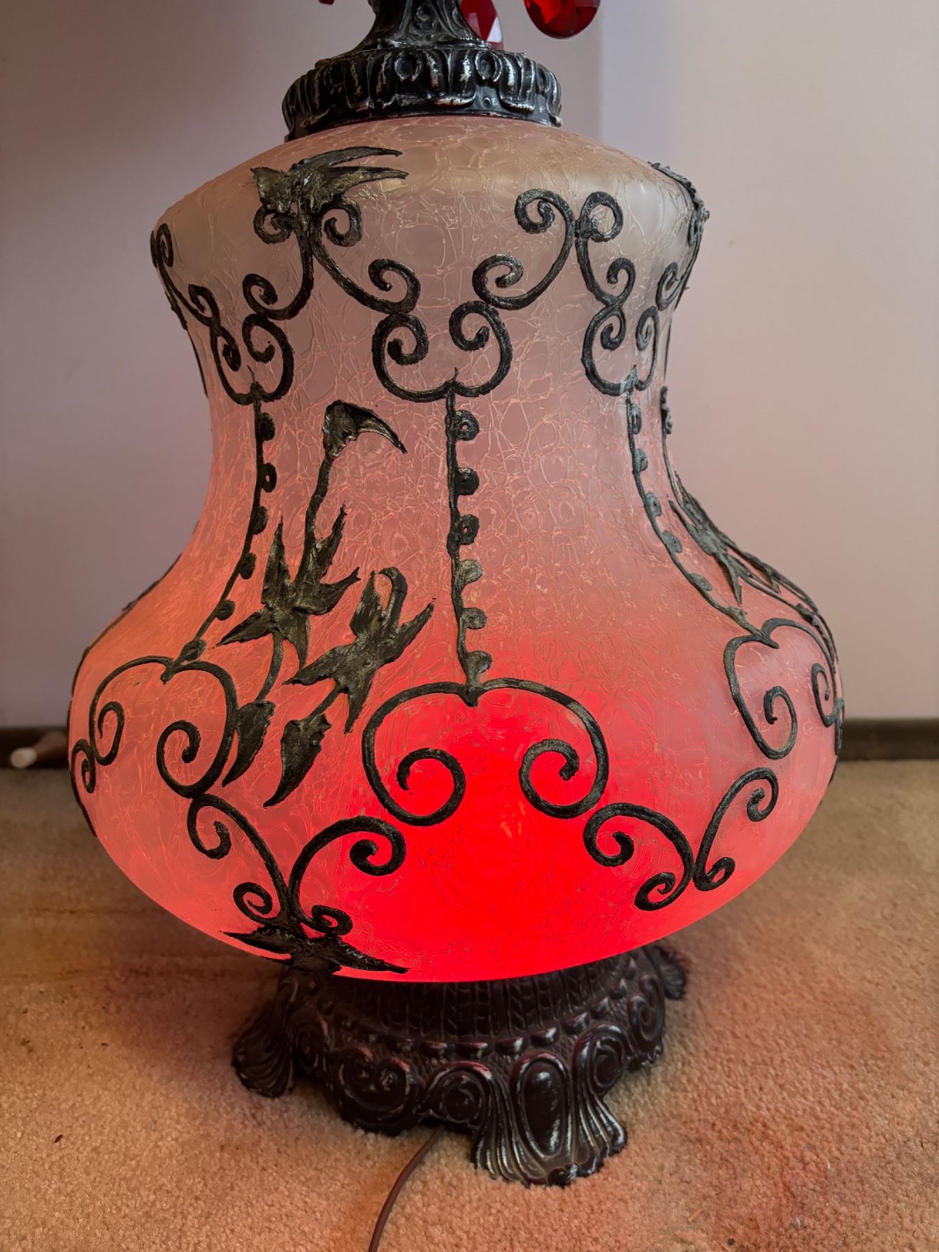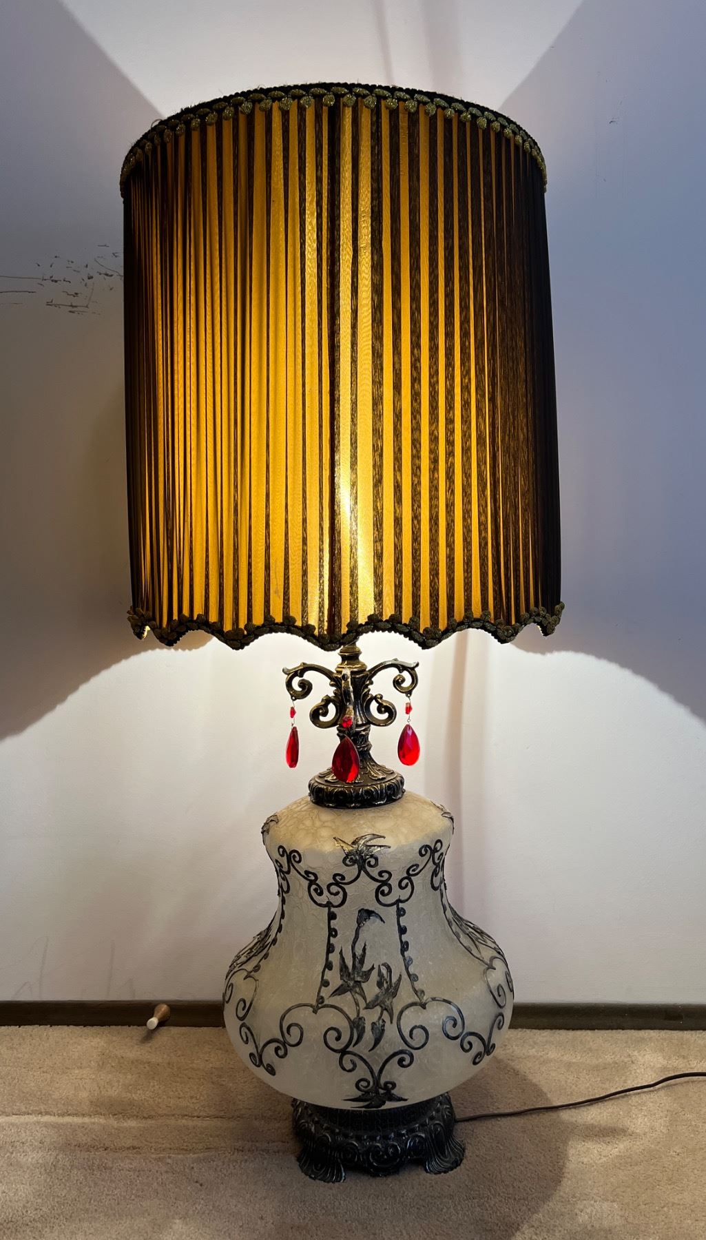 Both lights are in working condition, the frosted glass base also lights up, small dime sized stain on the inside of the lamp shade, Measures 18.5"diameter x 45"H