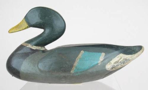 Oversized mallard drake made in the Albert Cormadelle or Bayou Gauche style by an unknown maker. Metal strap lead weight. Two exhibit tags attached to the bottom read, "Pensacola Museum of Art 9-15 to