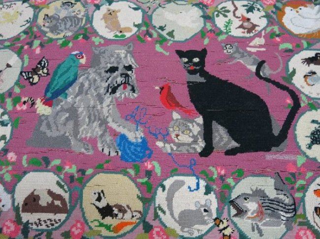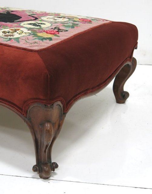 Needlepoint top depicting cat & dog. Approx. 14" H x 30" x 45". Some losses.