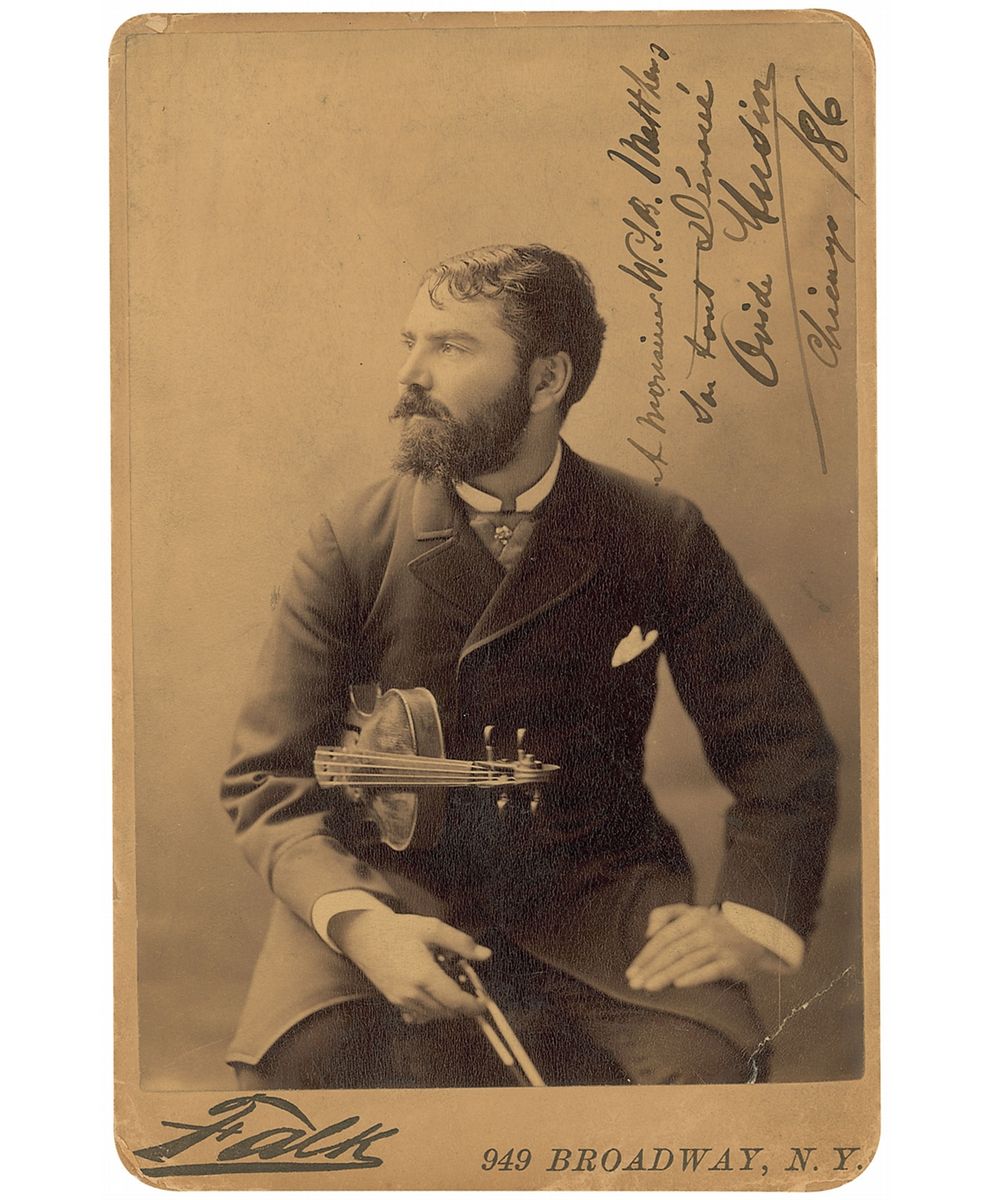 Belgian violin virtuoso and composer (1854–1929). Original 4.25 x 6.5 cabinet photo of Musin with his violin tucked under his arm by Falk of New York, signed and inscribed vertically in black ink in French and dated “Chicago /86.” In very good condition, with creasing to lower right, some light surface marks, scattered silvering to darker areas, and a few edge dings and creases.