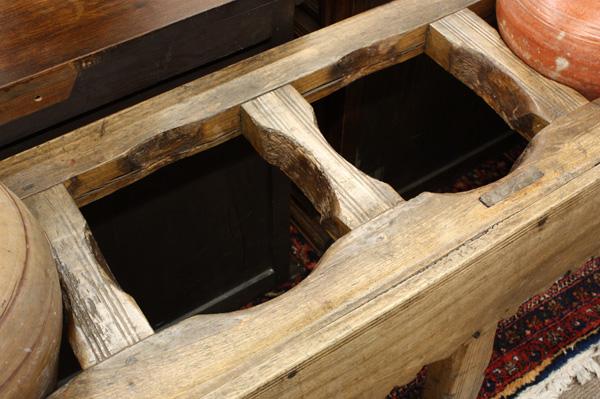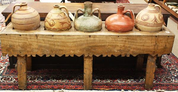 (lot of 6) Mexican ovoid jugs on stand, the handled examples having incising and paint decoration on the thrown bodies executed in both red and white clays, set within a Spanish Revival display stand having a scalloped apron and thru tenon construction, rising on square legs, largest vessel 18'', overall, 35''h x 66''w x 16''d