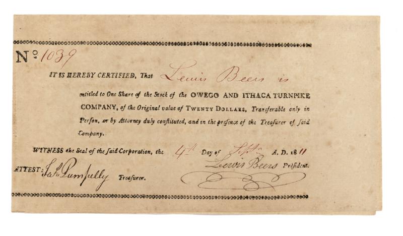 1811, New York. Stock certificate for "One share of the stock...of the Original value of twenty dollars..." Chartered in 1807, the road was completed in 1810 linking Owego and Ithaca, New York. Integral printed rules of transfer at left. Embossed company seal. Signed as president by Lewis Beers. Uncancelled and Excellent.