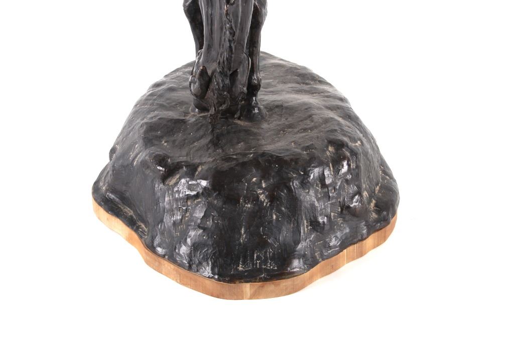 Featured in this lot is a bronze sculpture called "Bronc Rider," from Wyoming artist, Owen D Mort Jr., circa 1973. The sculpture features a wonderfully and professionally crafted bronze construction that shows a older cowboy riding a bucking horse with full rigging and holding the reins in his right hand. This bronze is mounted on a shield of hardwood. This bronze is an original that was contracted to be housed in The First National Bank and Trust Company of Wyoming and was contracted from Roman Bronze Co. to cast this bronze and was viewed on a custom stand. The condition of this bronze sculpture is good with no obvious signs of damage and shows good overall condition. The measurements of this bronze sculpture are 23 1/2" x 18 1/2" x 12". The collective weight of the sculpture is 50lb 8oz. Provenance: the Owen D. Mort, Jr. Collection. Owen David Mort was an American engineer who amassed an impressive collection throughout his worldwide travels. His collection has included art, artifacts and other historical items from which he has donated to museums at the University of Utah and the Snite Museum of Art at the University of Notre Dame. This bronze comes separately from the stand shown in the photos. This bronze comes complete with paperwork and records of the construction and a photo of Owen D. Mort Jr. constructing the first rendition of the bronze.*