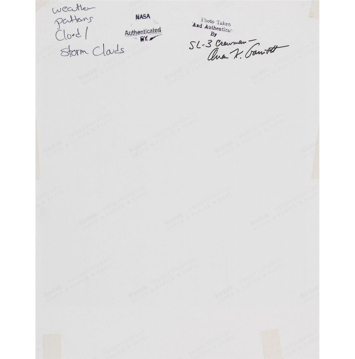 Color satin-finish 7 x 6.75 photo of of Hurricane Ellen as taken by Garriott from Skylab 3, matted to an overall size of 16 x 20, signed on the mat in black felt tip. Reverse of the photo bears a stamp that reads, “NASA authenticated by,” and issigned below in black felt tip, “SL-3 crewman—Owen K. Garriott.” In fine condition. Provenance: Superior Auction, Fall 1998.