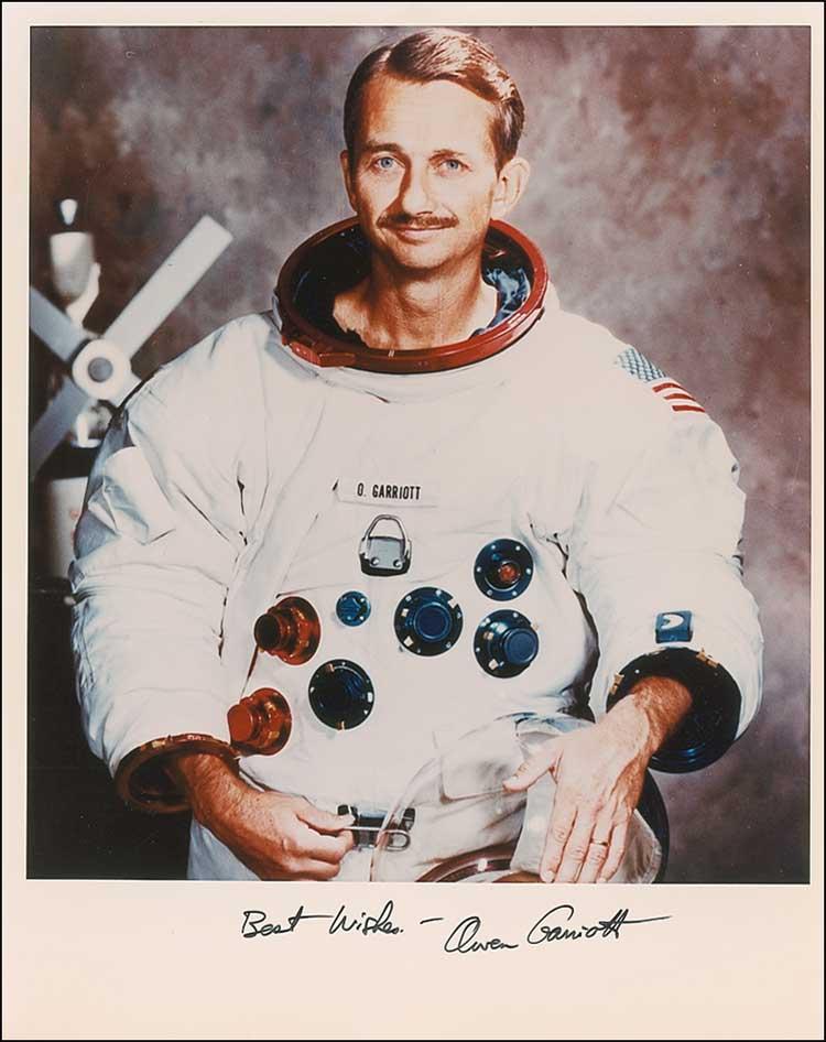 Color satin-finish 8 x 10 photo of Garriott in his white space suit, signed in the lower border in black felt tip, “Best wishes—Owen Garriott.” In very fine condition. Pre-certified Scott Cornish and RRAuction COA.