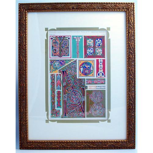 Framed bookplate from British Architect and Decorative Artist Owen Jones. From the publication "The Grammer of Ornament". Custom framed and matted in Europe on white and gold metallic board.