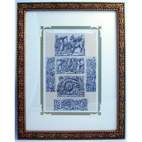 Framed bookplate from British Architect and Decorative Artist Owen Jones. From the publication "The Grammer of Ornament". Custom framed and matted in Europe on white and gold metallic board.