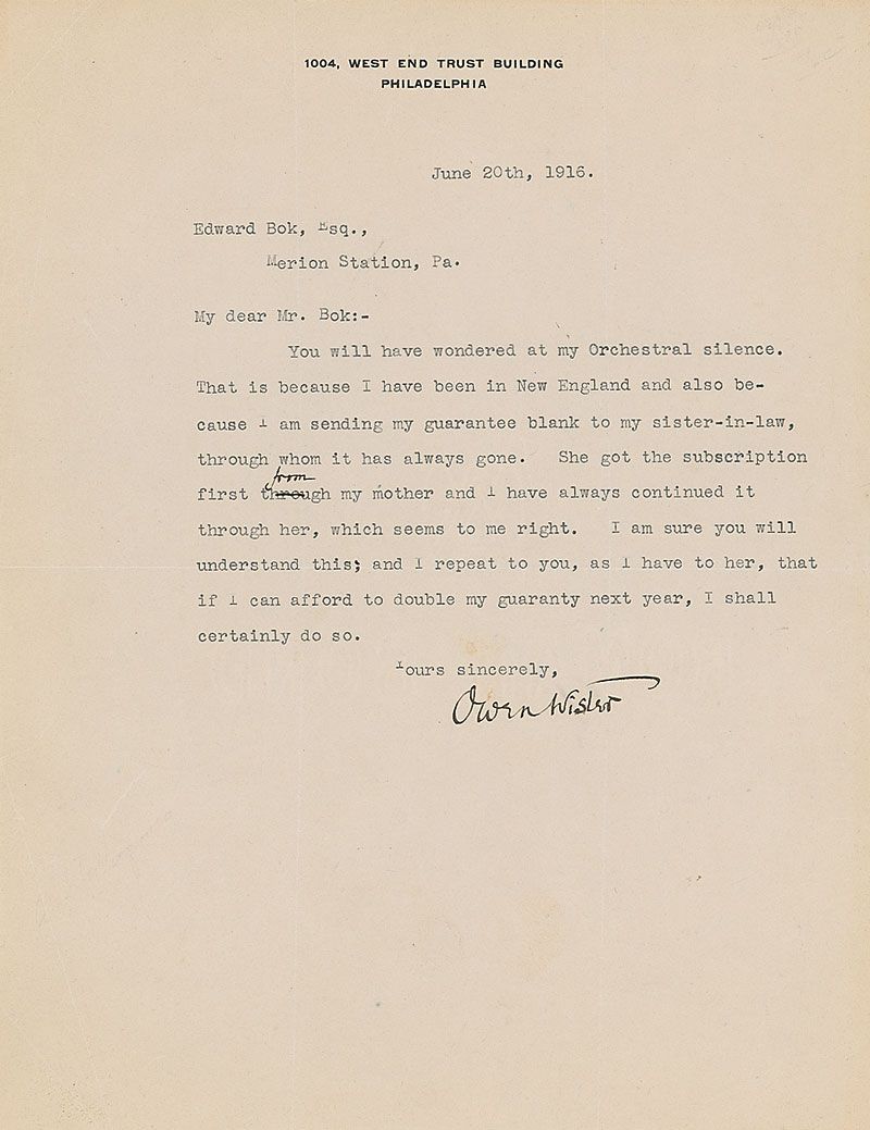 American writer (1860–1938) best known for his Western novel The Virginian. TLS, one page, 8.5 x 11, personal letterhead, June 20, 1916. Letter to Edward Bok. In part: “You will have wondered at my Orchestral silence. That is because I have been in New England and also because I am sending my guarantee blank to my sister-in-law, through whom it has always gone.” Intersecting folds and scattered creases, otherwise fine condition.