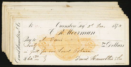 Owensboro, Kentucky, 1870, Account of David Hamilton & Co., 18 checks with orange 2 cent Washington revenue imprint, Fine to XF condition group, Ehrgott & Krebs.