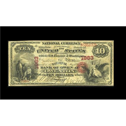 <B>Owenton, KY</B></I> - $10 Original Fr. 414 <B>The NB of Owen</B></I> Ch. # 1963<BR>Another great Kentucky rarity, and again coming in a $10 Original Series note, a rarity from this state in itself. This bank issued First Charters only before liquidating in 1883. By 1910, just $505 remained unredeemed. This piece was part of the Martin holdings, and is the only example known on this short lived bank. It is an attractive piece which grades <B>Fine</B></I> overall, but there is a repair in the center, where a small hole previously existed. Nevertheless, there are no others, so even the most discriminating of collectors has no choice here. Buy this note, or go without, likely forever.