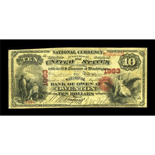 <B>Owenton, KY</B></I> - $10 Original Fr. 414 <B>The NB of Owen</B></I> Ch. # 1963<BR> A great Kentucky rarity coming in a $10 Original Series note, a rarity from this state in itself. This bank issued First Charters only before liquidating in 1883. By 1910, just $505 remained unredeemed. This piece was part of the Martin and Gale holdings, and is the only example known on this short lived bank. It is an attractive piece which grades <B>Fine</B></I> overall, but there is a repair in the center, where a small hole previously existed. Nevertheless, there are no others, so even the most discriminating of collectors has no choice here. Buy this note, or go without, likely forever.<BR><BR><b>Shipping:</b> Coins & Currency (<a target="_blank" href="http://www.heritageauctions.com/common/shipping.php">view shipping information</a>)