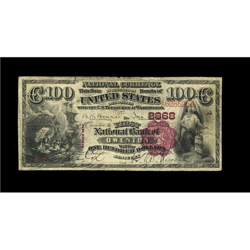 <B>Owenton, KY</B></I> - $100 1882 Brown Back Fr. 519 <B>The First NB</B></I> Ch. # 2868<BR>This small bank elected to issue only high denomination examples during its entire span of operation. Just five large examples are known, all Blue Seal hundreds, with the exception of this attractive Brown Back. <B>Fine,</B></I> with plenty of honest circulation, but displaying bright colors and sharp pen signatures.