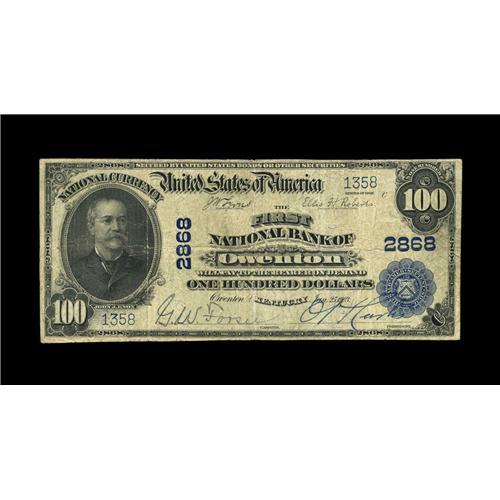 <B>Owenton, KY</B></I> - $100 1902 Plain Back Fr. 698 <B>The First NB</B></I> Ch. # 2868<BR>A decent evenly circulated $100 Blue Seal to match the Brown Back above. Pen signed <B>Fine.</B></I>