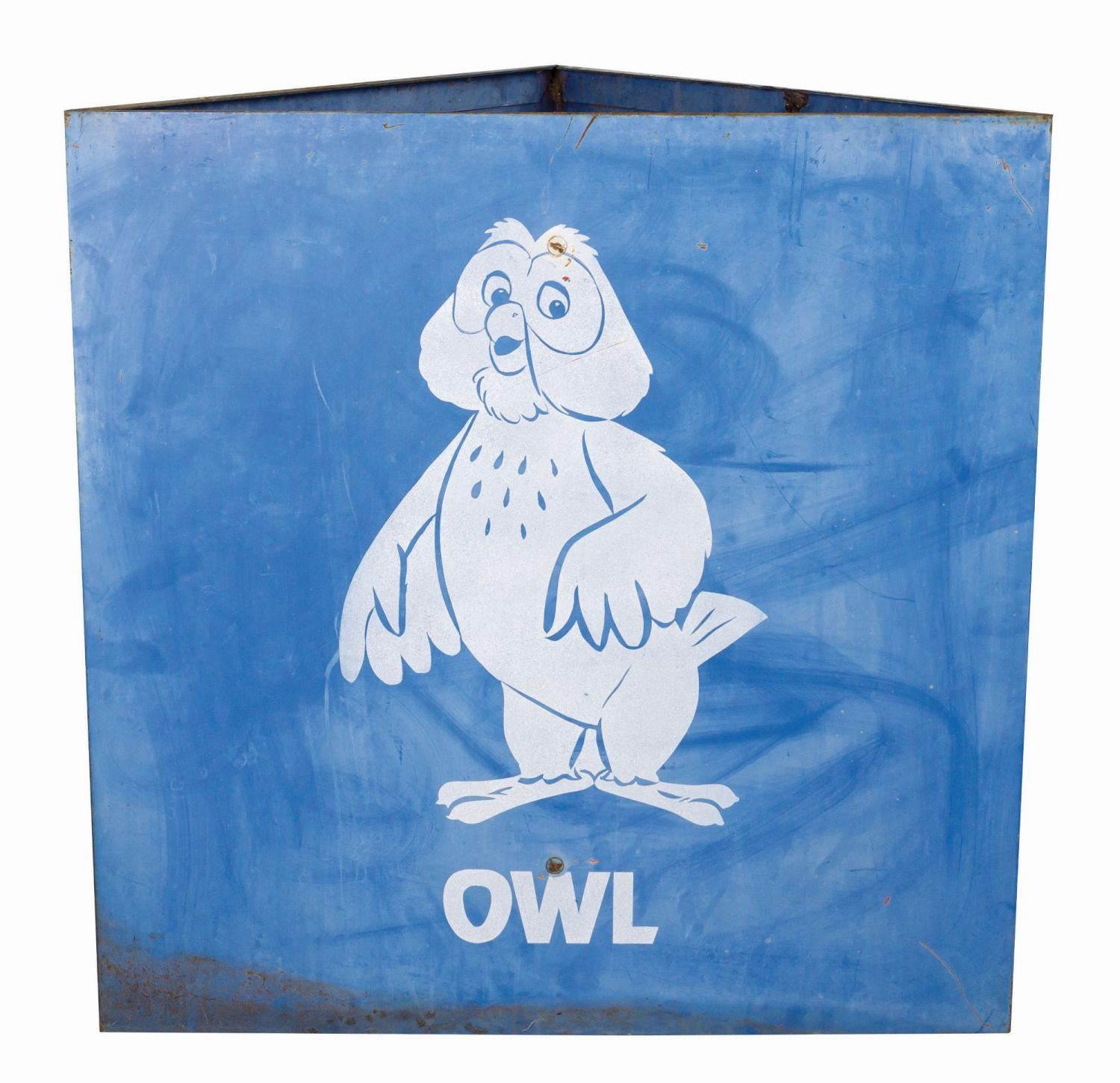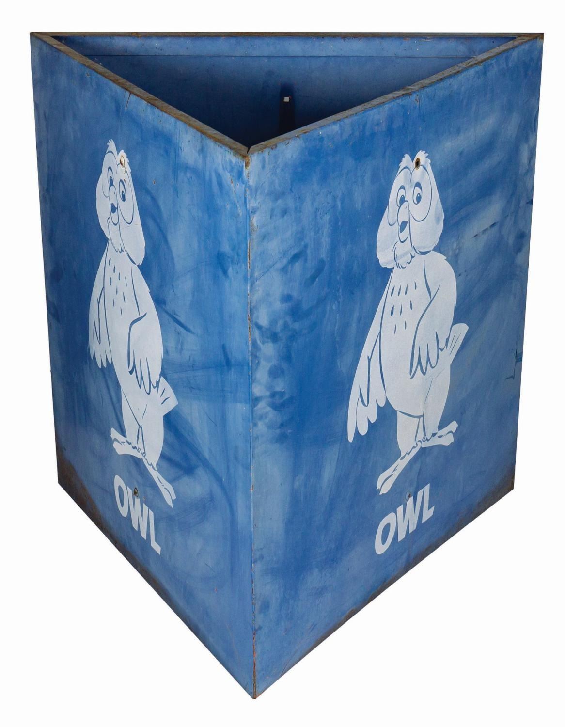 (Disneyland, 1990s) A large triangular metal parking lot sign from Disneyland. Each 30"x30" side features the name and depiction of Owl from Winnie the Pooh. The condition is good with various dings and wear throughout from the sign's park use and removal. This item may require special shipping arrangements, please inquire for details and estimates.