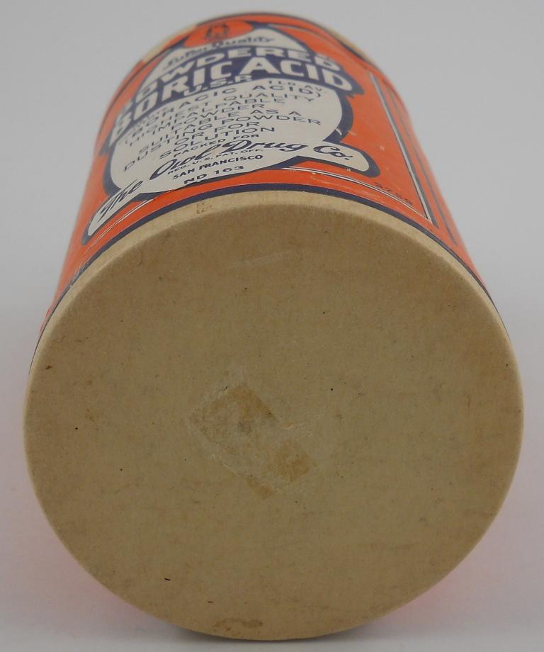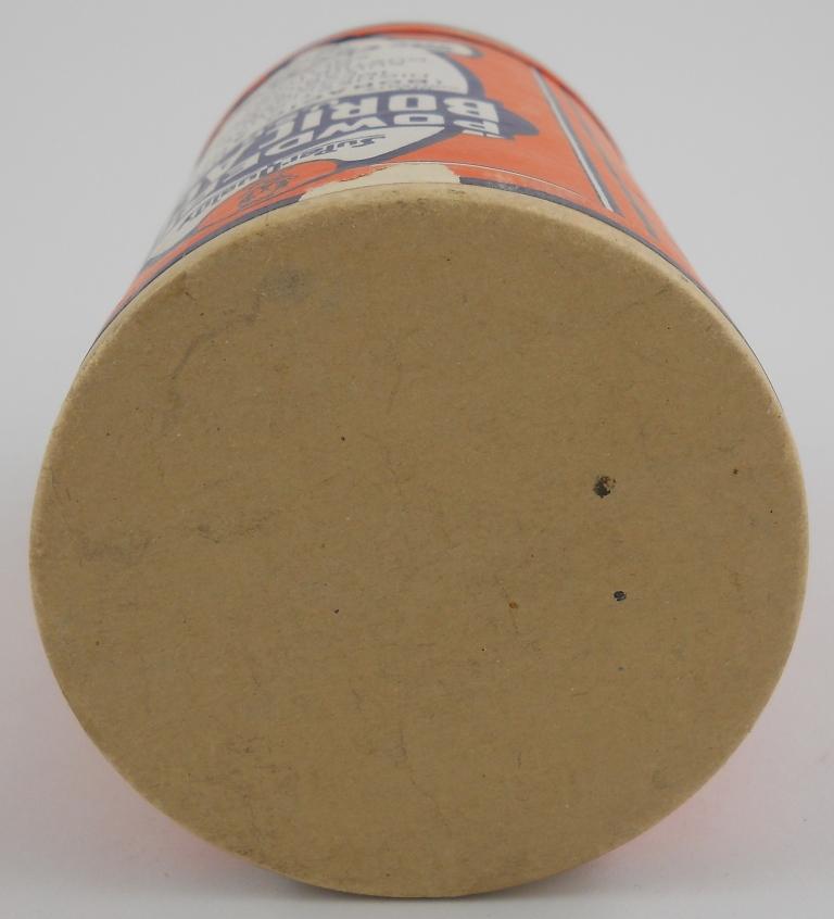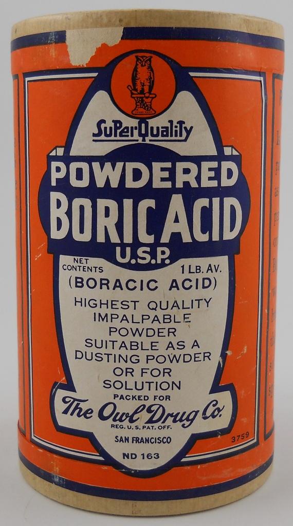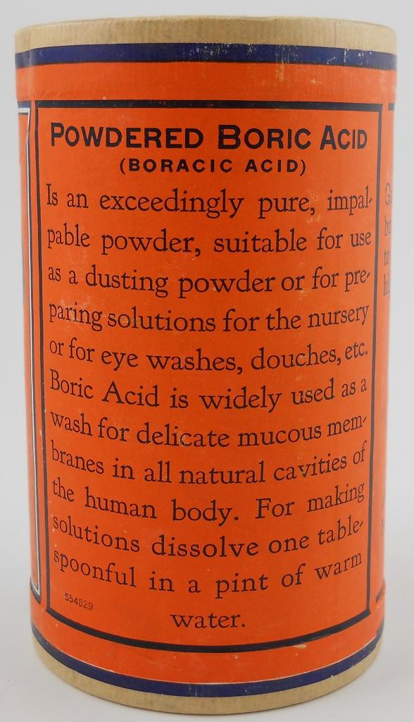 This container for Powdered Boric Acid is full and unopened. The size is 6 inches tall x 3-5/8 inches in diameter. It is super clean, with just a small part of the label missing on the top front. We are selling this for its collector value -- the contents should not be used.