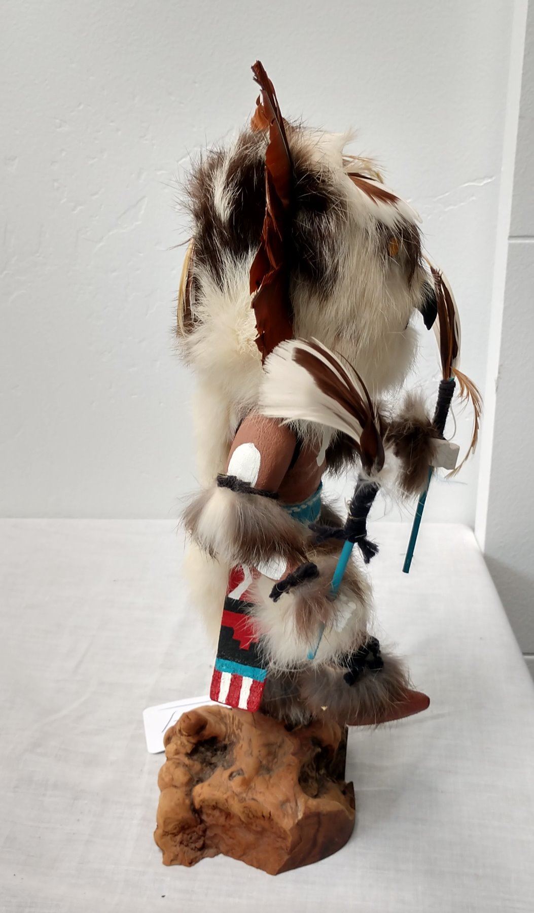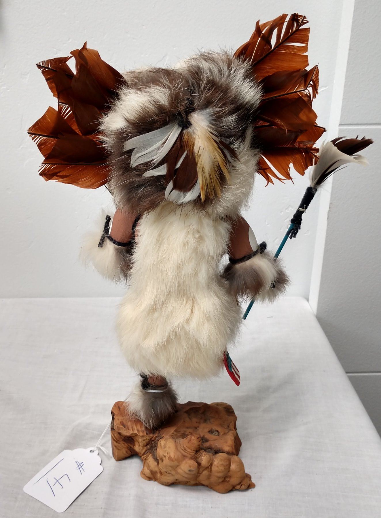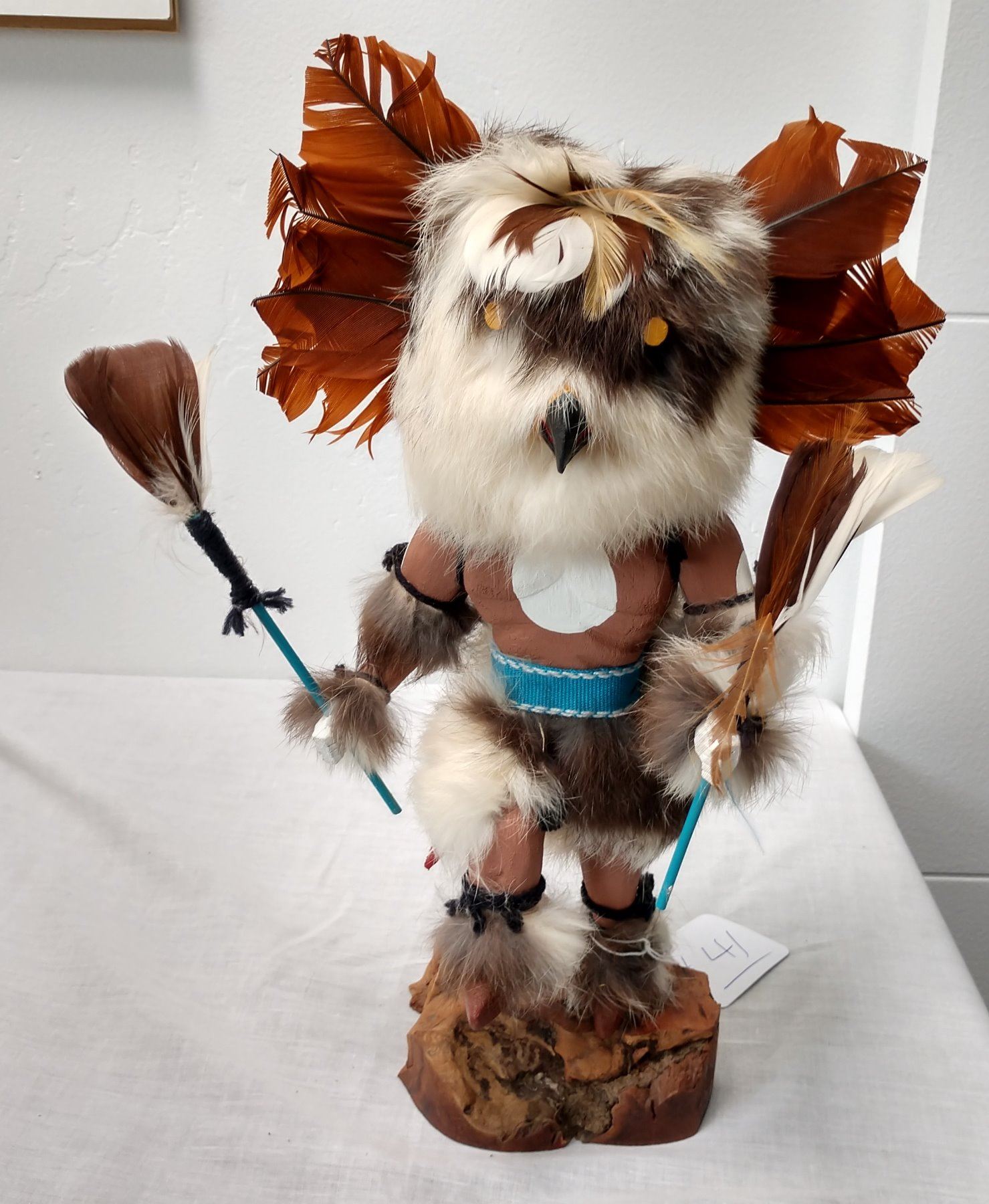 Owl Kachina, c. 1970s. Made of cottonwood, fur and feathers, the item measures 12" x 7" x 4". Hopi, Arizona. Signed on bottom. Condition: Good, see images. Shipping: $26.50 w/insurance and signature, due to size.
