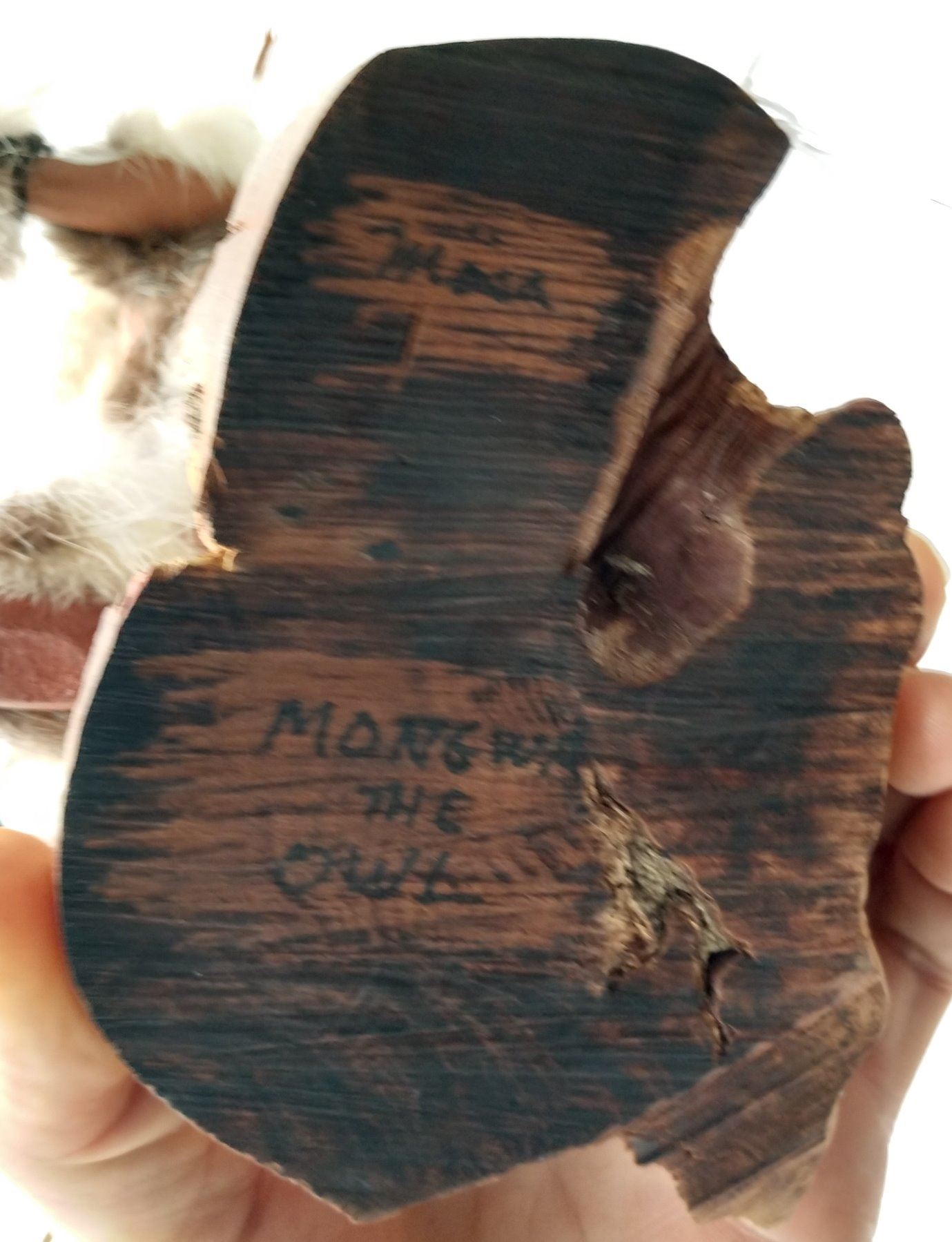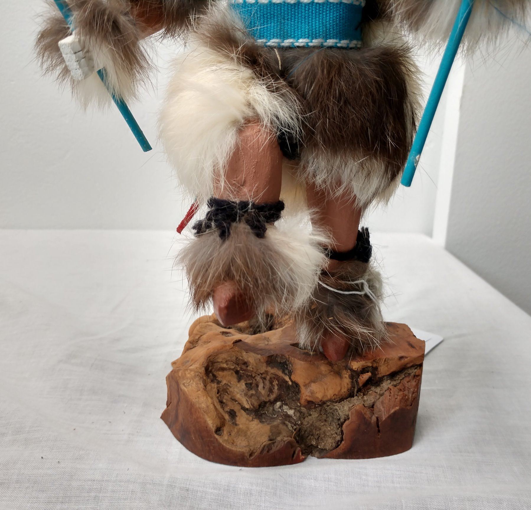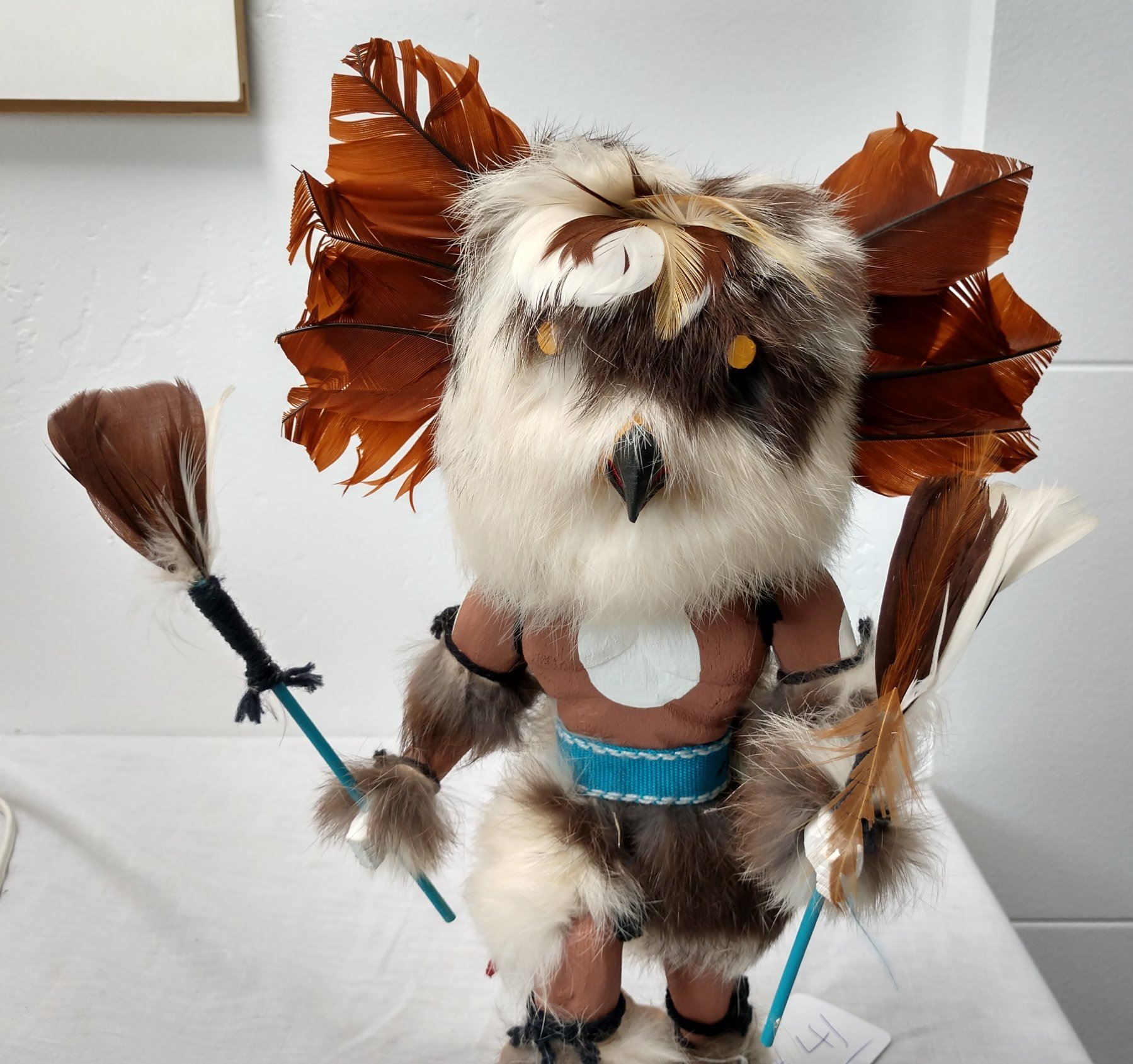 Owl Kachina, c. 1970s. Made of cottonwood, fur and feathers, the item measures 12" x 7" x 4". Hopi, Arizona. Signed on bottom. Condition: Good, see images. Shipping: $26.50 w/insurance and signature, due to size.