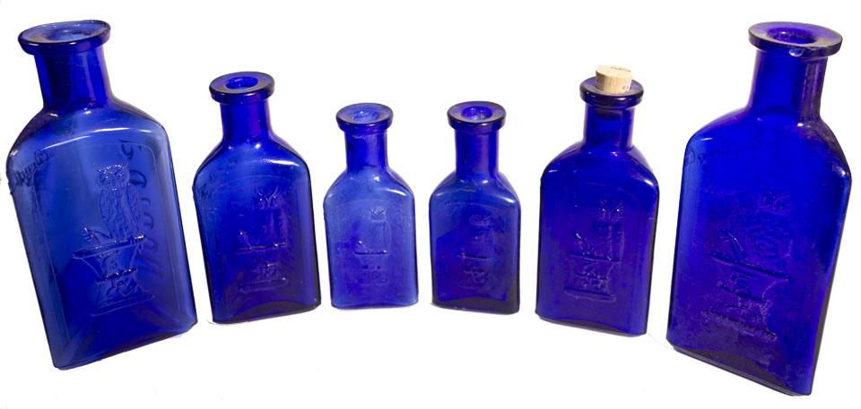 Lot of 6.  Variety of three different sized bottles.  Two are 3 1/4 inches tall.  Two are 1 1/2 inches tall and two are 1 5/8 inches tall.  Owl in slug plate.  Large eyes.