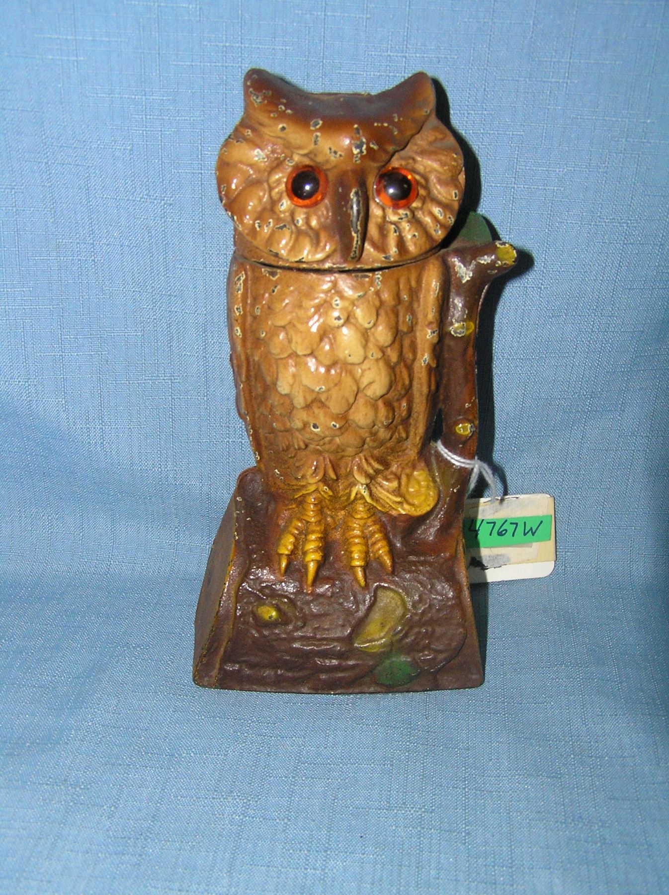 Owl Turns Head cast iron mechanical bank circa 1950s from the Book of Knowledge series est. value $400.00-$450.00