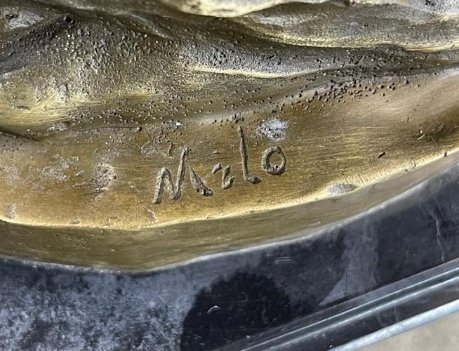This sculpture of large life size owl is scary but amazingly stunning with its owl wings spread fully as is he just landed on this broken tree trunk. The owl has large downward-facing eyes, a hawk-like beak and a flat face; and his conspicuous circle of feathers are beautiful.. Most birds of prey sport eyes on the sides of their heads, but the stereoscopic nature of the owls forward-facing eyes permits the greater sense of depth perception necessary for low-light hunting. Although owls have binocular vision. Their large eyes are fixed in their sockets — as are those of other birds — so they must turn their entire head to change views. Owls can rotate their heads and necks as much as 270 degrees in either direction. As owls are farsighted, they are unable to see clearly anything within a few centimeters of their eyes. Caught prey can be felt by owls with the use of filo-plumes — small hair-like feathers on the beak and feet that act as feelers. Their far vision, particularly in low light, is exceptionally good. The owl was cast using the archaic method of lost-wax casting and stained with a brown patina finish for perpetuation. The bronze sculpture was rests upon a black marble base and is signed by artist Milo.