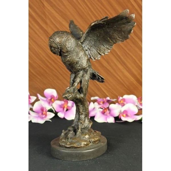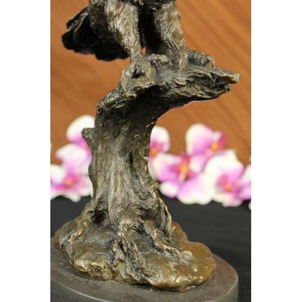 This sculpture of this medium size owl is scary but amazingly stunning with its owl wings spread fully as if he just landed on this broken tree trunk. The owl has large downward-facing eyes, a hawk-like beak, and a flat face, and his conspicuous circle of feathers is beautiful. Most birds of prey sport eyes on the sides of their heads, but the stereoscopic nature of the owl forward-facing eyes permits the greater sense of depth perception necessary for low-light hunting. Their large eyes are fixed in their sockets as are those of other birds so they must turn their entire head to change views. Owls can rotate their heads and necks as much as 270 degrees in either direction. As owls are farsighted, they are unable to see clearly anything within a few centimeters of their eyes. Caught prey can be felt by owls with the use of filoplumes small hair-like feathers on the beak and feet that act as feelers. Their far vision, particularly in low light, is exceptionally good. The owl was cast using the archaic method of lost wax casting and stained with a brown patina finish for perpetuation. The bronze sculpture was rested upon a marble base. Dimensions: Height 12 X Width 10 inches. Weight: 8 LBS.