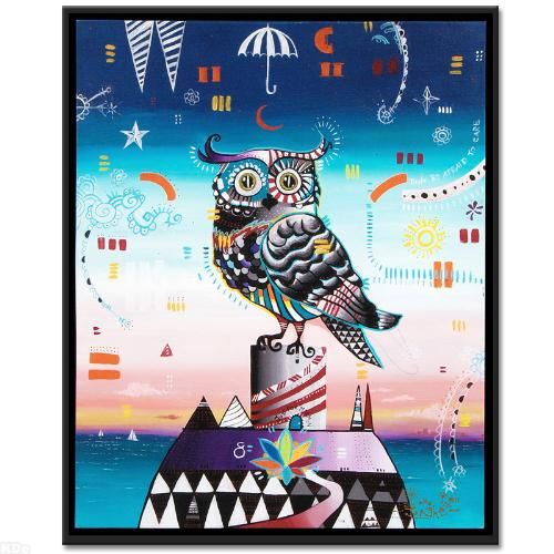 With a fusion of cultural imagery and modernistic elements Giorgio Casu creates vibrant and eye catching works of contemporary art deeply rooted in pop culture. "Owl" is a limited edition giclee on canvas by Giorgio Casu, numbered and hand signed by the artist. This piece is custom framed floating, using acid free and archival materials and is ready to hang. Includes Certificate of Authenticity! 24.5" x 29.5" (with frame), 23" x 27.5" (image).