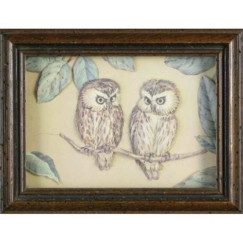 This is a very creative shadow box that is in very good condition. This three dimensional style of art is very attractive and eye-catching. The realism of the owls in this shadow box is outstanding. Its design convinces the viewer of its reality and gives a sense of tangibility. This picture is excellently framed in a wormy wood frame that enhances the rustic nature of the picture and measures, 6.5?? x 8.5?. This is a very unique picture at a great price.This picture is excellently framed in a wood frame that is lined with fabric and enhances the rustic nature of the picture and measures, 16.5?? x 9.5?. This picture is modestly priced considering this style of print is rarely seen.