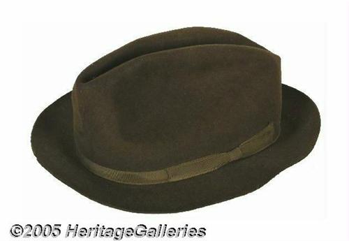<B>Own the Legendary Howard Hughes' Brown Hat</B></I> It looks ordinary enough at first. A vintage brown hat made by Johnson Brothers of London for Brooks Brothers. Then you notice the initials embossed into the headband, "HRH," and you realize that they stand for Howard Robard Hughes. If you've seen <I>The Aviator,</B></I> it hits you that Leonardo DiCaprio, portraying Hughes, wears a copy of this very hat in several scenes of that movie. Then you fully realize that this is <I>the hat,</B></I> the hat that one of the most interesting, wealthy and enigmatic figures of the 20th century often wore. Howard Robard Hughes, Jr. was born at Houston, Texas in 1905, the son of Howard Robard Hughes, Sr., founder of Hughes Tool Company, and Allene (Gano) Hughes, a doting mother who had a phobia about germs, rushing young Howard to the doctor with every sniffle and treating his young playmates as disease carriers, discouraging her son from socializing. When Howard, Jr. was about four years old, something happened that would eventually shape his life; Howard, Sr. and his partner Walter Sharp patented a drill bit. The first bit that could easily penetrate solid rock, it revolutionized oil drilling, and made Hughes and Sharp rich. Howard grew up in the upper crust of Houston society and attended private school in Boston where he did better in golf than he did in his classwork. A plane ride with his father during this period was an experience that stimulated a life-long love of aviation. In 1922, Hughes' mother died. While attending Rice Institute (now University) two years later, his father died suddenly and, at age eighteen, Howard received access to a large part of the family estate and dropped out of Rice. He quarreled with his family and had company lawyers buy out his relatives. Howard was granted legal adulthood on December 26, 1924, and took control of the tool company. On June 1, 1925, he married Houston socialite Ella Rice. The next few years Hughes traveled to Hollywood to make movies. An early "talkie" titled <I>Hell's Angels</B></I> (1930) that Hughes wrote and directed was about World War I flying aces. It was at this point that he took flying lessons and obtained his pilot's license. He would spend much of the next two decades flying, racing, designing and manufacturing aircraft. It was during this period that Hughes often wore the famous hat offered here. There are numerous photos of him wearing it while in or next to his beloved airplanes. It ended up in the possession of Hughes' friend and trusted Hughes Tool Company executive, Bob Kuldell. Last offered to the public at a May 21, 1989 auction by Simpson's Auction Galleries in Houston, this is the only Howard Hughes hat known to be in private hands and it could very well be in your hands, if you're the lucky winning bidder of this lot. Fine condition, worthy of inclusion in the finest collection or museum. Lot:254