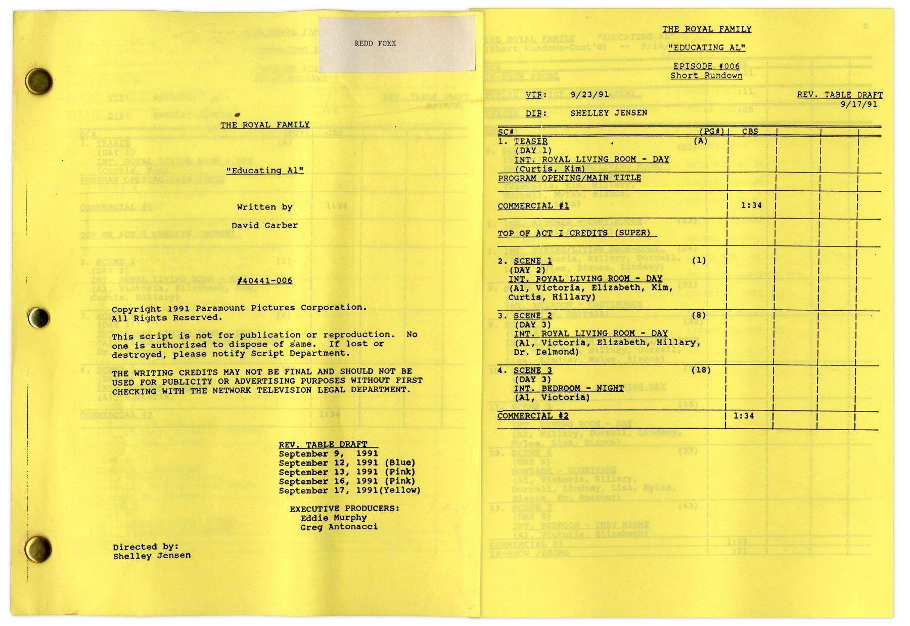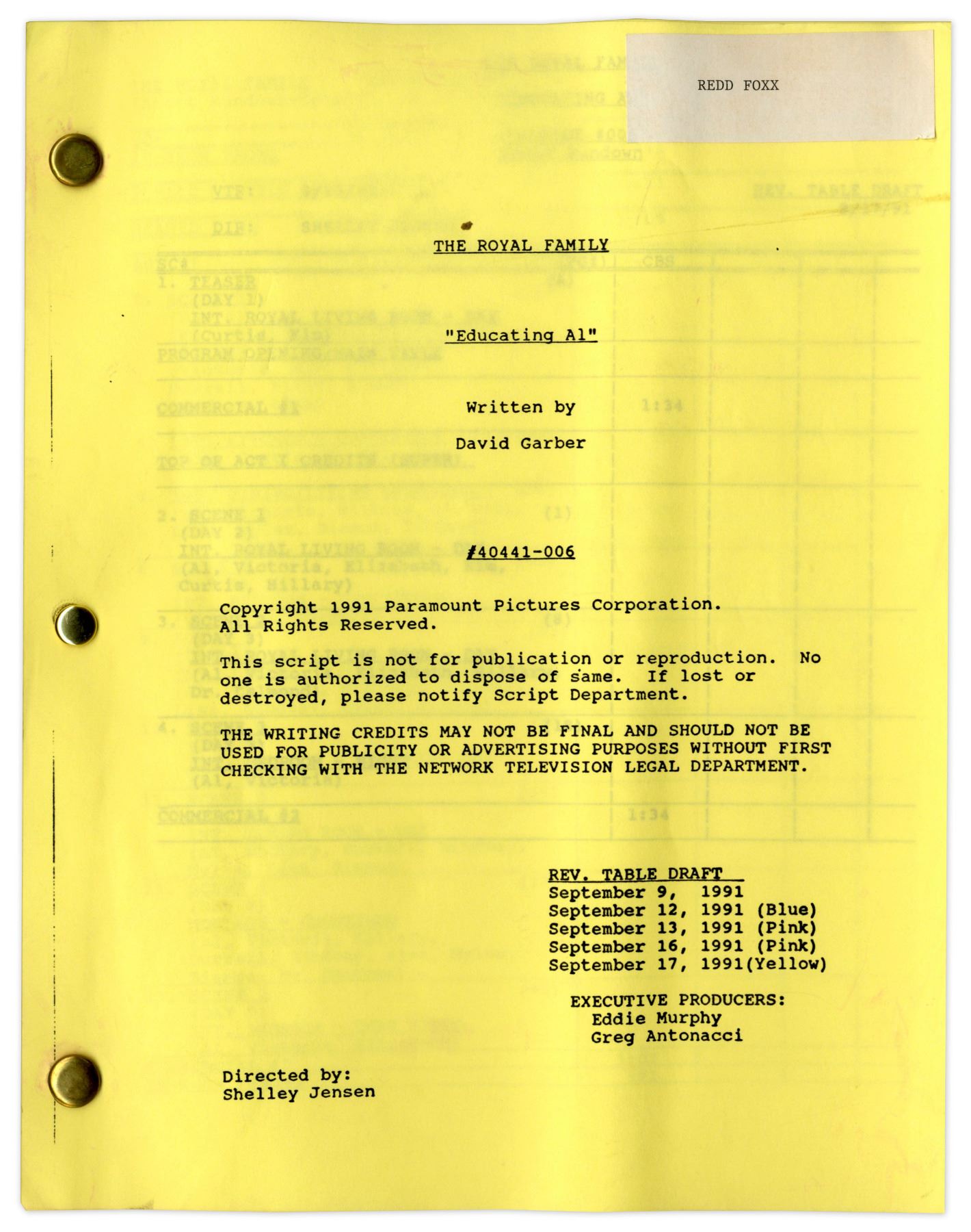 ''The Royal Family'' Episode 7 Revised Table Draft Script Owned by Redd Foxx -- Dated Weeks Before Foxx's Death -- 45 Pages -- Very Good Condition -- From Redd Foxx Estate