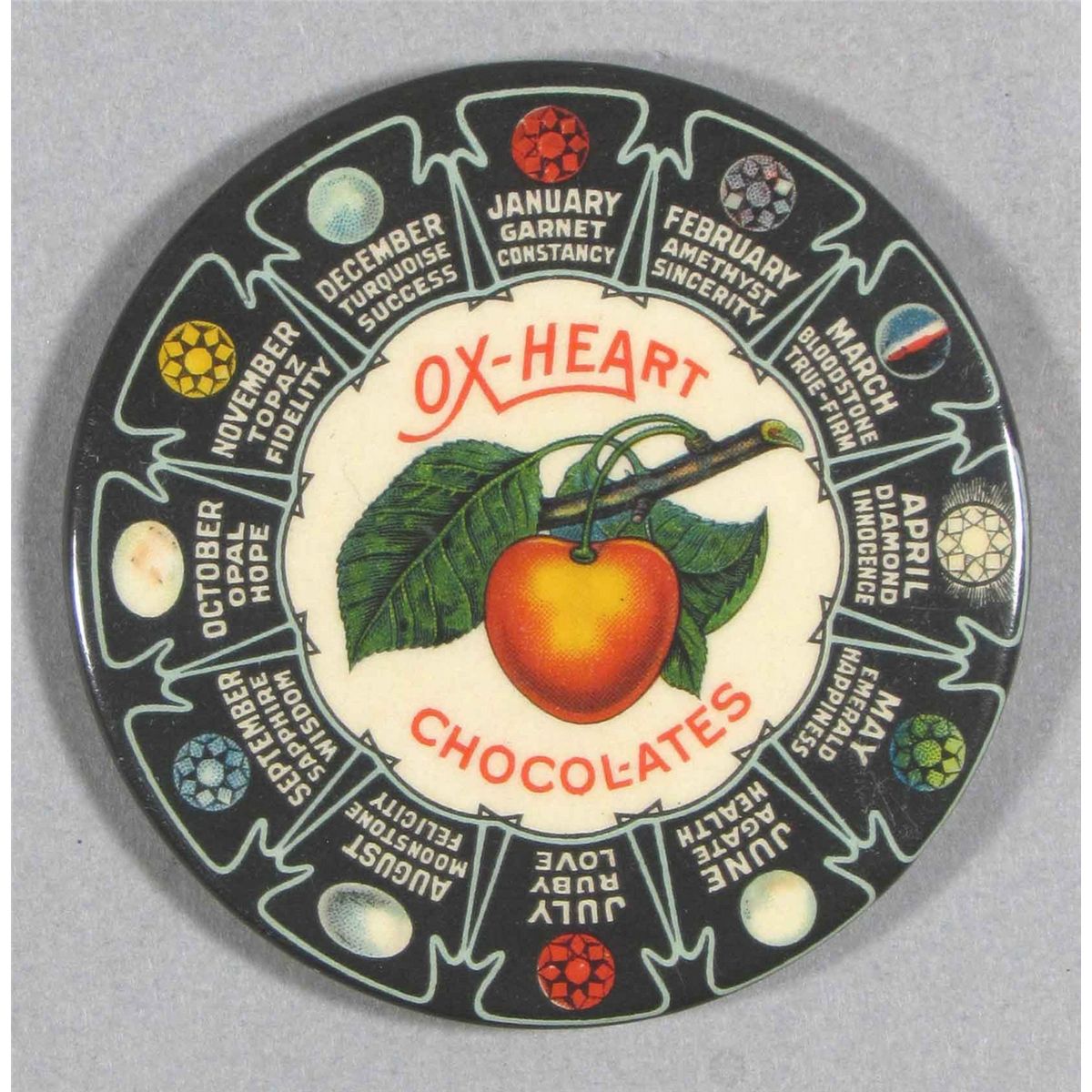 Ox-Heart Chocolate Celluloid Pocket Mirror. Depicting birthstone chart. Excellent condition. 2 inch diameter.Start Price $20
