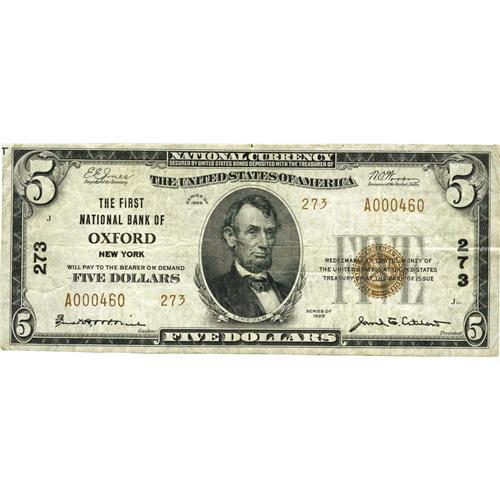 <B>Oxford, NY</B></I> - $5 1929 Ty. 2 <B>The First NB</B></I> Ch. # 273<BR>This Chenango County bank is considerably scarcer in small size than large, with this example the first Type 2 five to surface. Nice <B>Fine-Very Fine.</B></I>