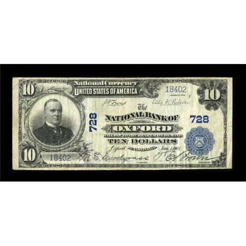 <B>Oxford, PA</B></I> - $10 1902 Plain Back Fr. 624 <B>The NB of Oxford</B></I> Ch. # 728<BR> The first of two decent mid-grade large examples from this sought after Chester County location. <B>Fine-Very Fine,</B></I> with a tiny portion of a bank stamp on the reverse which affects nothing. <BR><BR><b>Shipping:</b> Coins & Currency (<a target="_blank" href="http://www.heritageauctions.com/common/shipping.php">view shipping information</a>)