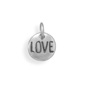 Oxidized sterling silver charm engraved with "Love". This charm measures approximately 8mm. .925 Sterling Silver