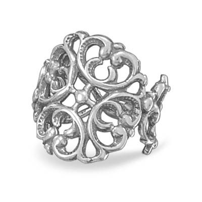 Oxidized sterling silver ornate scroll heart design ring. The design area across the top of the ring measures approximately 22mm. This ring is available in whole sizes 6-10. .925 Sterling Silver