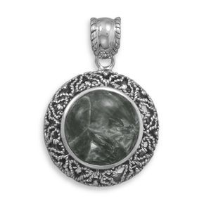 Oxidized sterling silver pendant with 18mm seraphinite and heart pattern design. The pendant measures 28mm x 40mm. .925 Sterling Silver