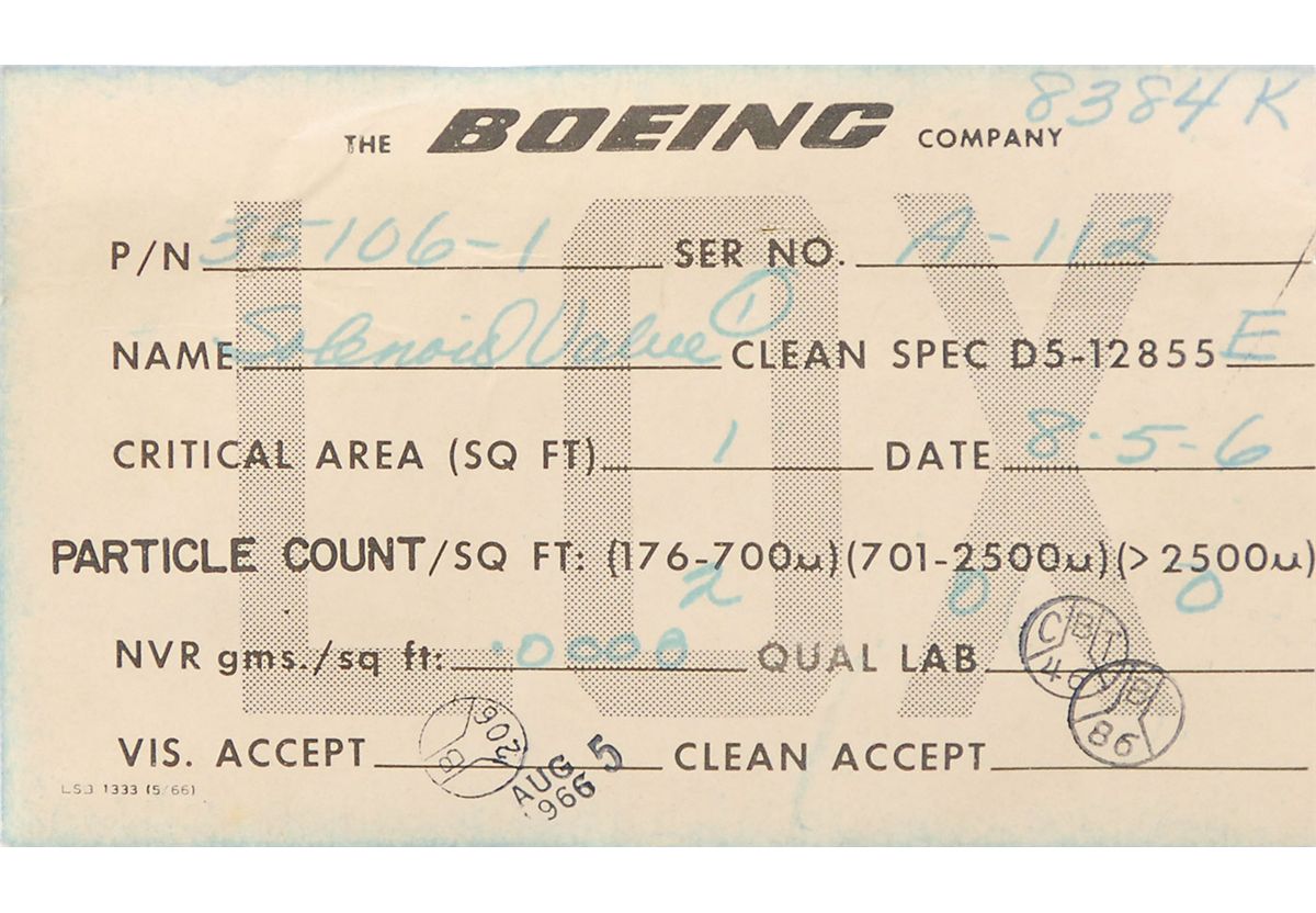 Collection of two pieces of ground support hardware from the Saturn V S-IC program: an unused oxidizer start valve, 3.5 x 2.5 x 3, manufactured by Futurecraft Corp; and a Saturn LOX System solenoid valve, serial no. A-112, accompanied by its original Boeing cleaning tag. In fine condition.