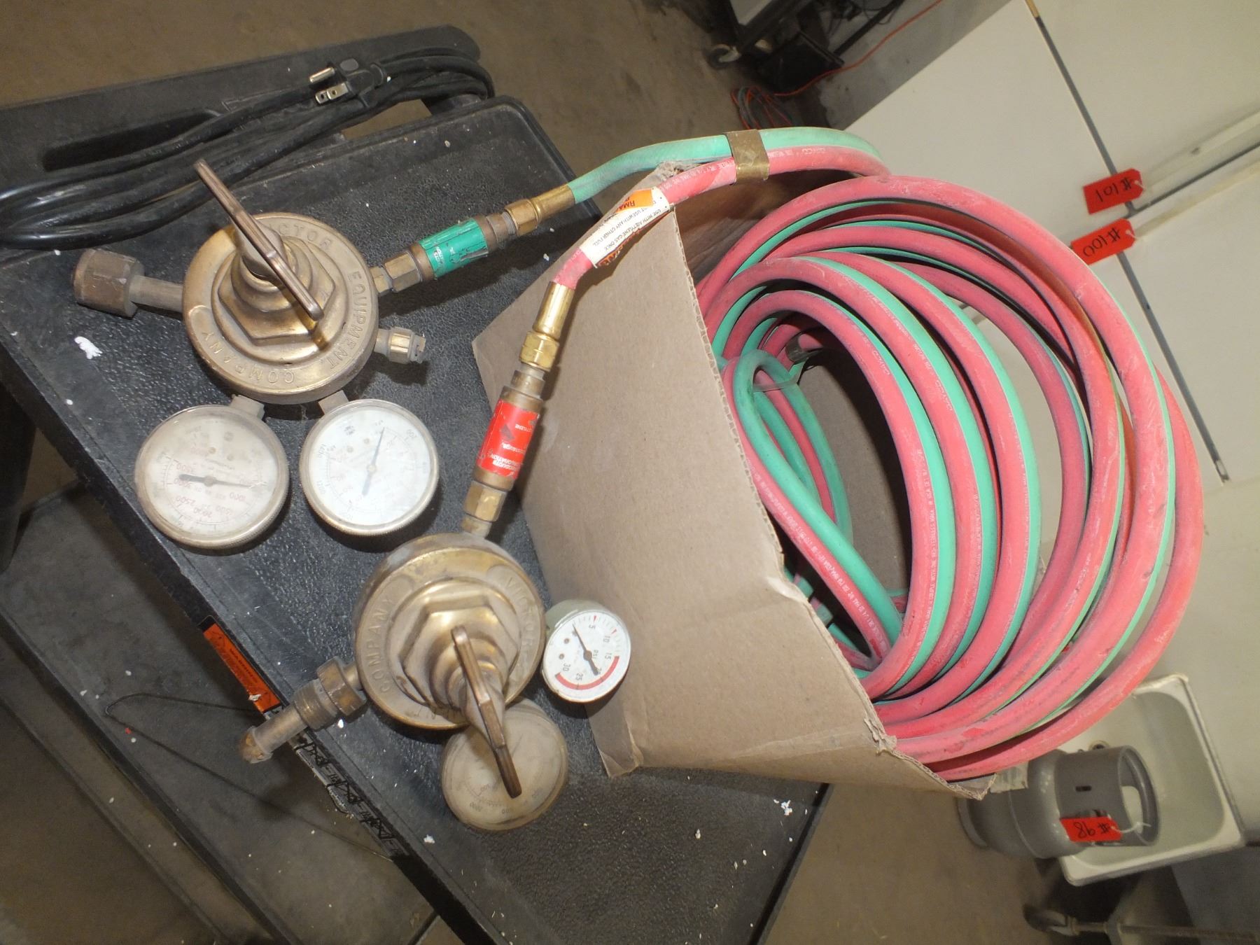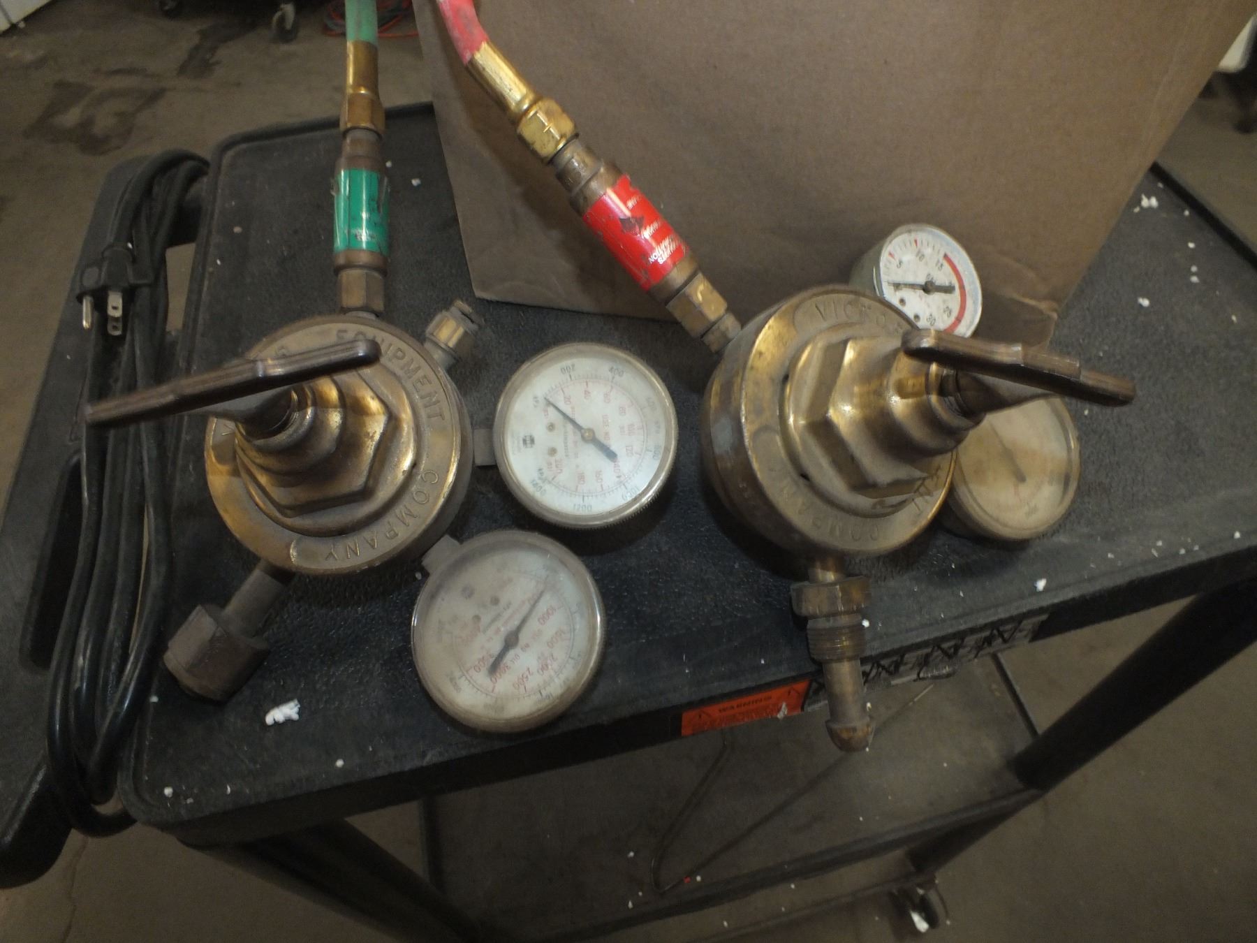 Oxy Acetylene Hoses w/ Regulators, 1 gauge missing a cover...used