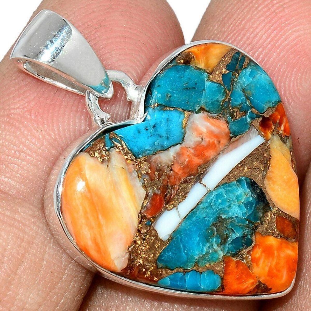 Spiny oyster shell & Arizona turquoise set in heart shaped sterling silver pendant. 1 1/4" L. 6.4 grams weight, gemstone & silver.Â