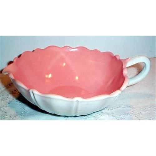 This wonderful Singled Handled Heart Shaped Oyster and Pearl Bowl is decoratee with a fired on pink interior and white exterior. The bowl is in SUPERIOR condition with no chips, cracks, or dings and it meausrs 6" from spout to handle and is about 5" wide and stands about 1.50" tall.