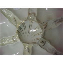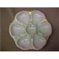Oyster plate, gilt scalloped rim and line decoration, each oyster well with graduated pink to cream color, raised shell design around center well, unmarked, 9 1/4" diameter