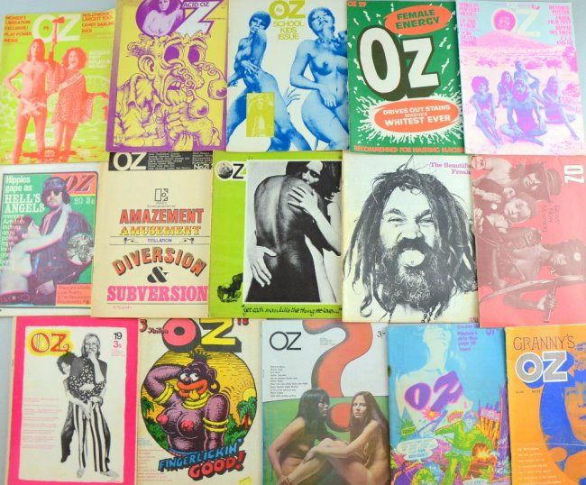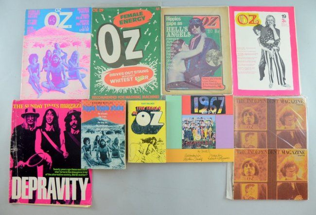 Oz Magazine, 35 issues ranging from No 8 - 38, some duplicates, 1968-73, three books 'The Trials of Oz', '1967 Is This It?' & 'Hippie Hippie Shake' and two newpaper supplments realting to Oz