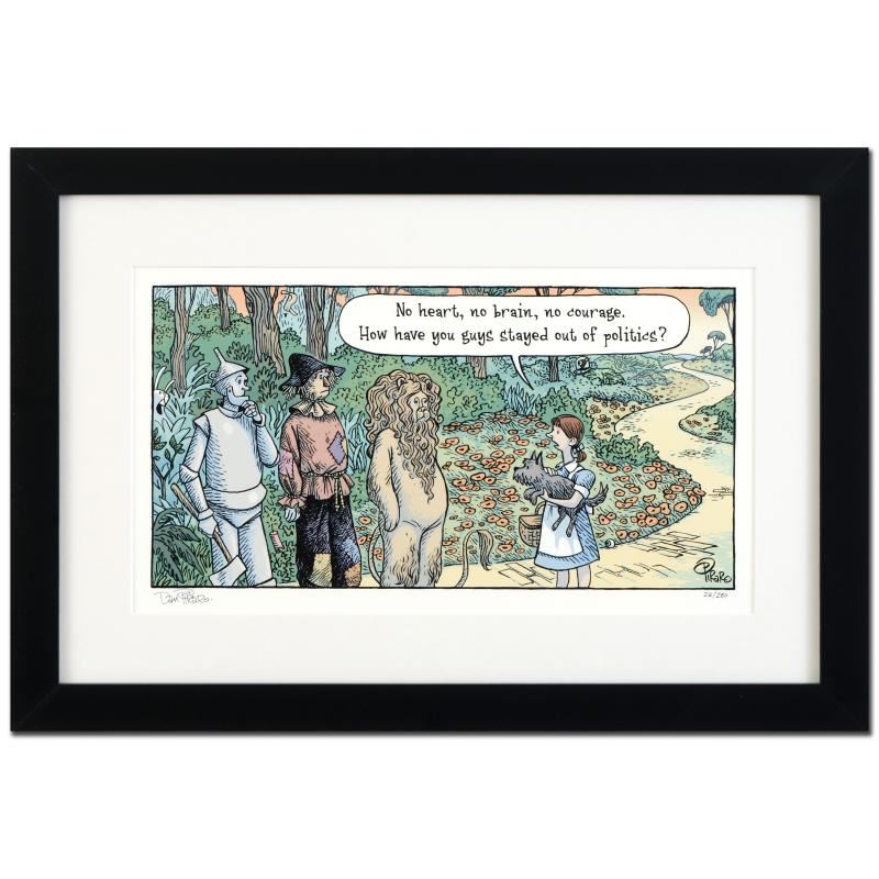 Enter a surreal and satirical world of twisted imagination and award winning creativity. "Oz Politicians" is a limited edition giclee on paper by Dan Piraro, creator of the critically acclaimed and award winning comic strip, Bizarro! This piece is framed, numbered and hand signed by the artist! Includes Certificate of Authenticity! Measures approx. 22" x 15" (with frame), 15" x 8" (image).