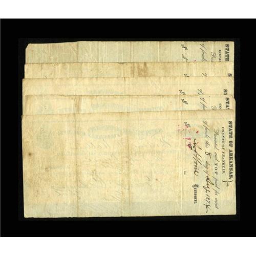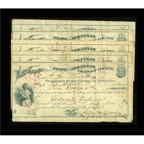 <B>Ozark, AR- Treasurer of Franklin County</B></I> 1872/1873 County Warrants<BR>Five pieces, all issued for various amounts, and all noted on the reverse "Presented, and NOT paid for want of funds" with dates ranging between 1872 and 1874. These are different in form and size from the Franklin County warrant offered above. Most all grade <B>Fine-Very Fine.</B></I>