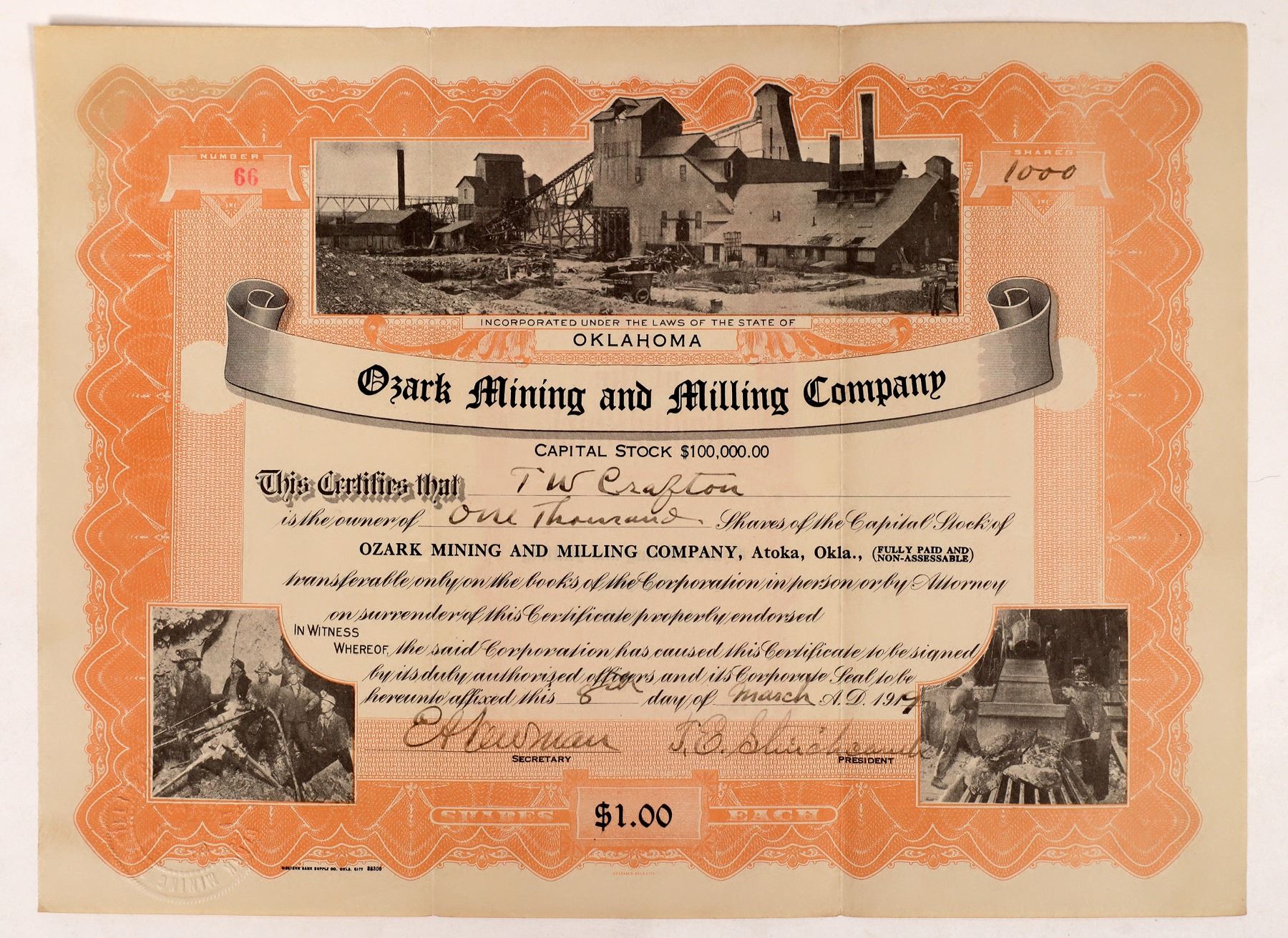 Issued 1917 Ozark Mining and Milling stock with 3 photo based vignettes of mill and miners.