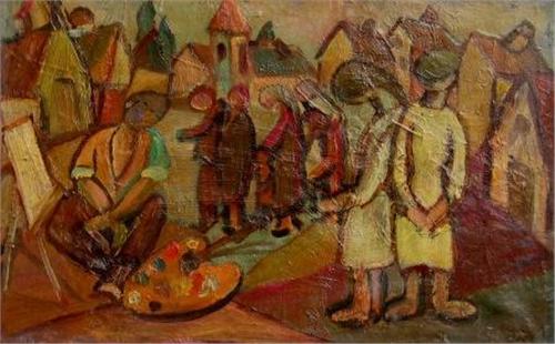 Ozer Shabbat, 1901 - 1978, People in the Village, Oil on canvas, 32x52 cm, Signed., , , , ,