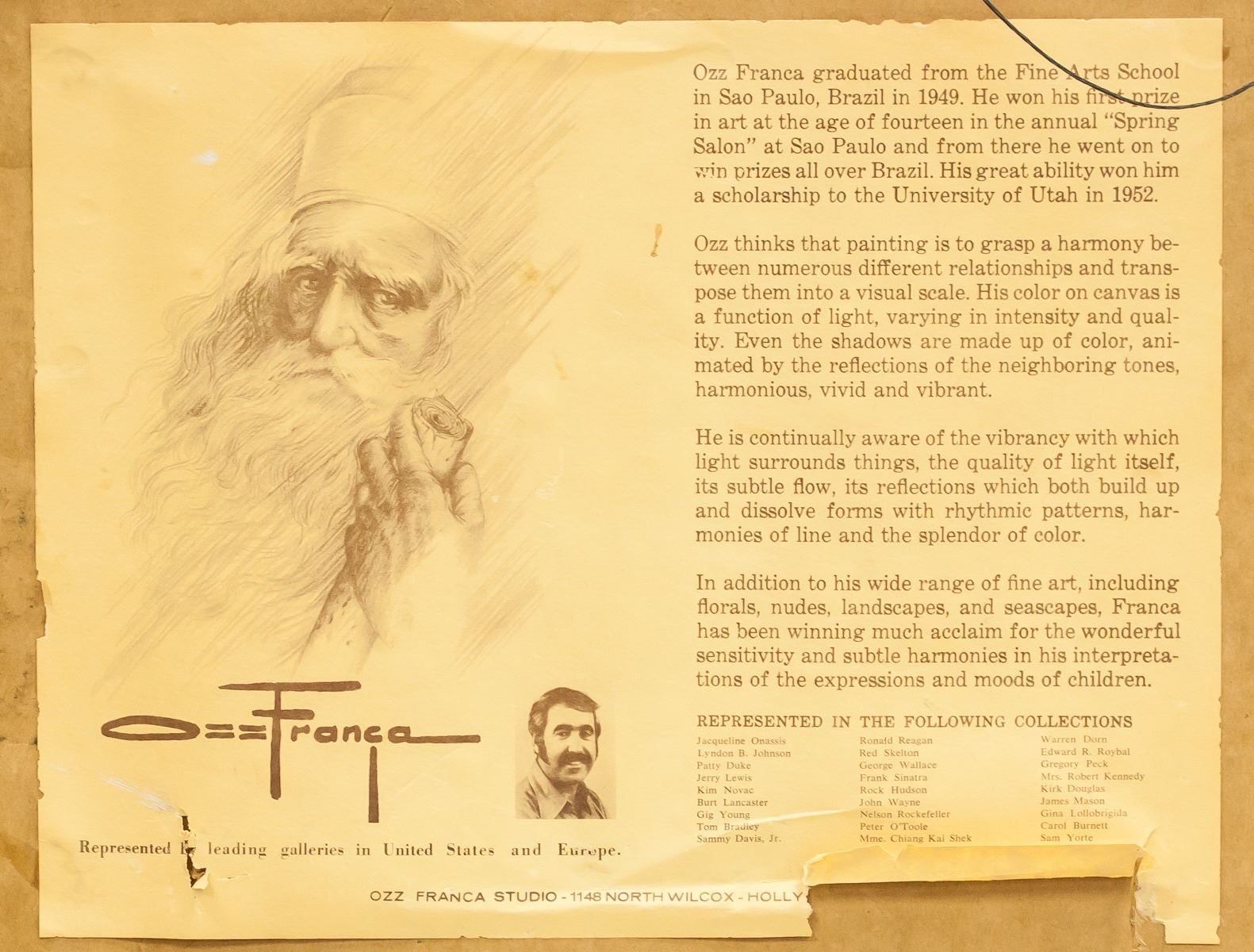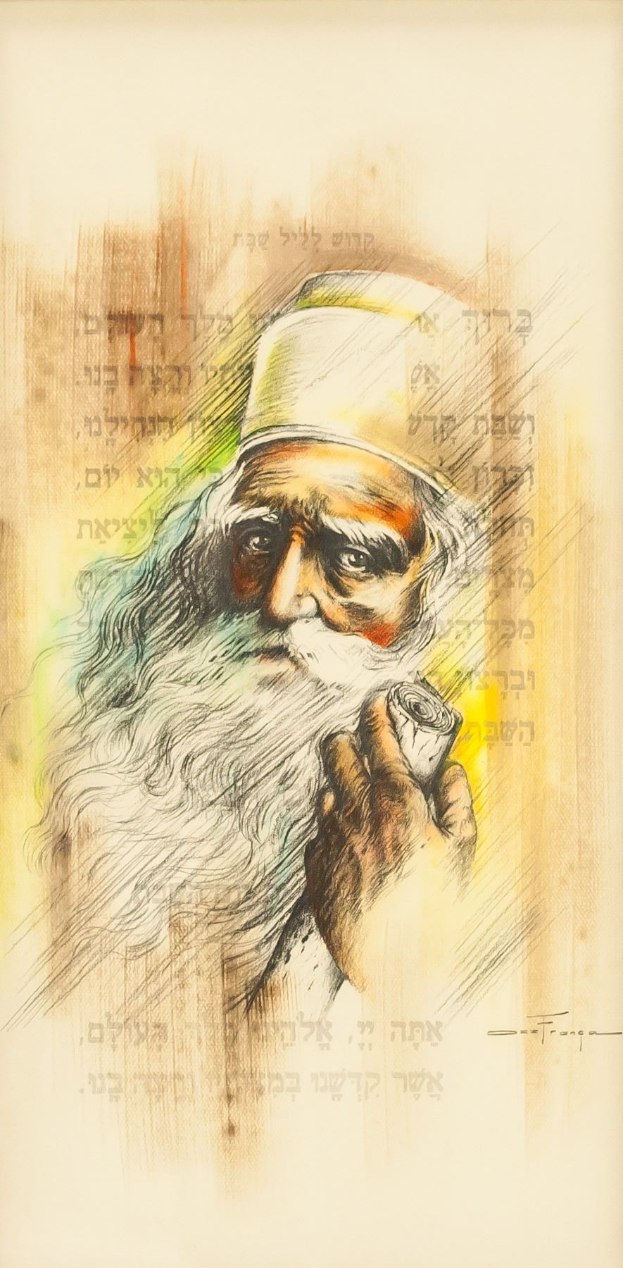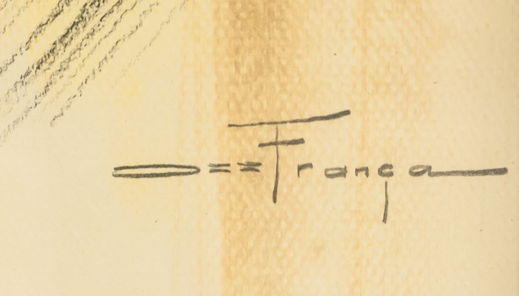 Lithograph on paper, framed. Featuring portrait of a white-bearded man. Signed "Ozz Franca" to the bottom right. Label affixed to verso provides an artist biography. "To [illegible] Love Ozz Franca" inscribed on verso. Attributed to Ozz Franca (1928-1991, Brazilian). 80 x 41 cm (31.5 x 16 in). Provenance: This lot carries limited provenance from a Private American collection, Los Angeles, CA