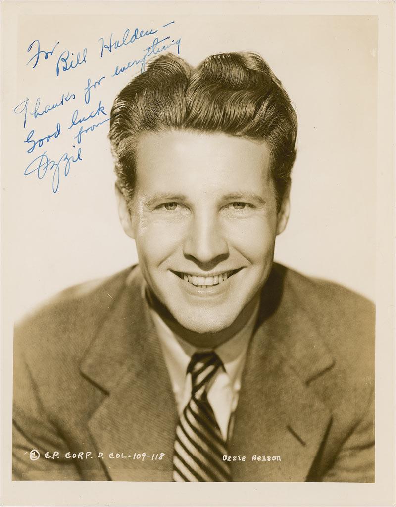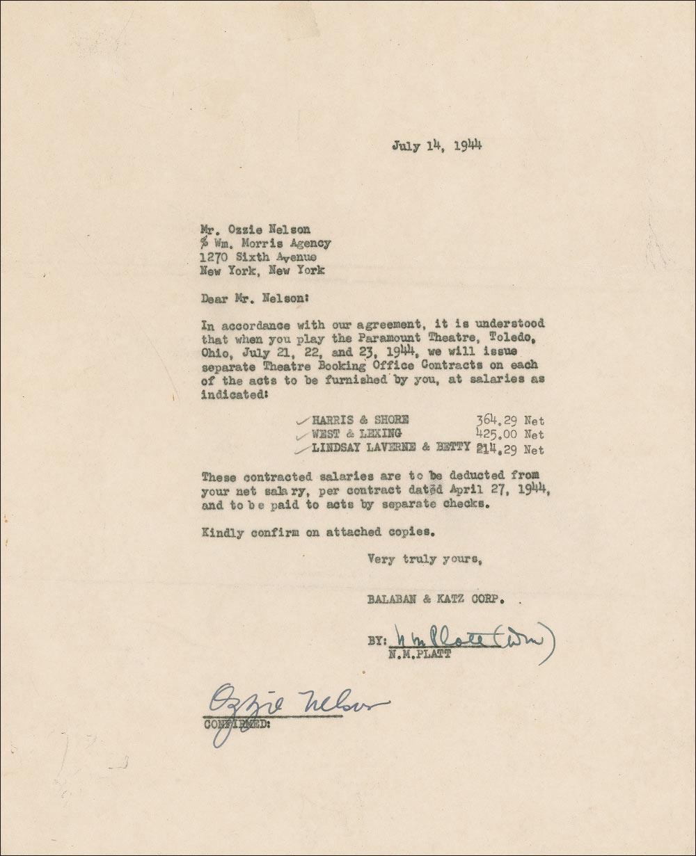Vintage glossy 8 x 10 photo, signed and inscribed in fountain pen, “For Bill Haldeau-Thanks for everything. Good luck, Ozzie”; and one onionskin page DS, signed “Ozzie Nelson,” dated July 14, 1944, regarding three acts furnished by Nelson for Toledo, Ohio’s Paramount Theatre, and their respective salaries. In very good condition, with uniform mild toning to document, and scattered creasing to photo.