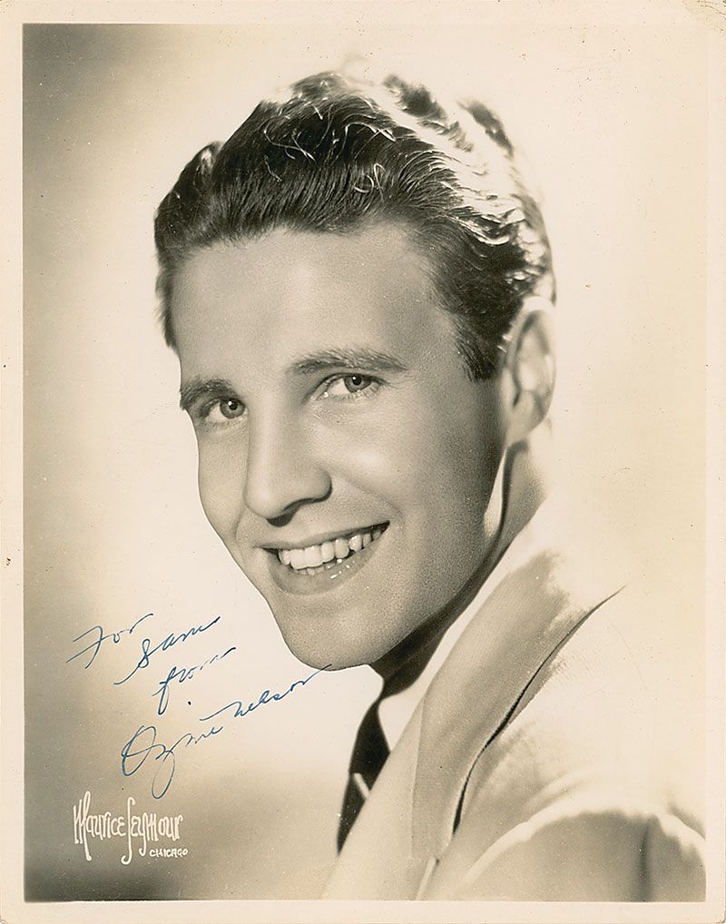 Vintage glossy 8 x 10 Maurice Seymour portrait of Nelson, signed and inscribed in fountain pen, “For Sam, from Ozzie Nelson.” In fine condition.